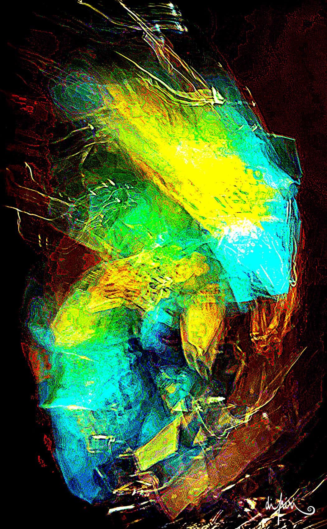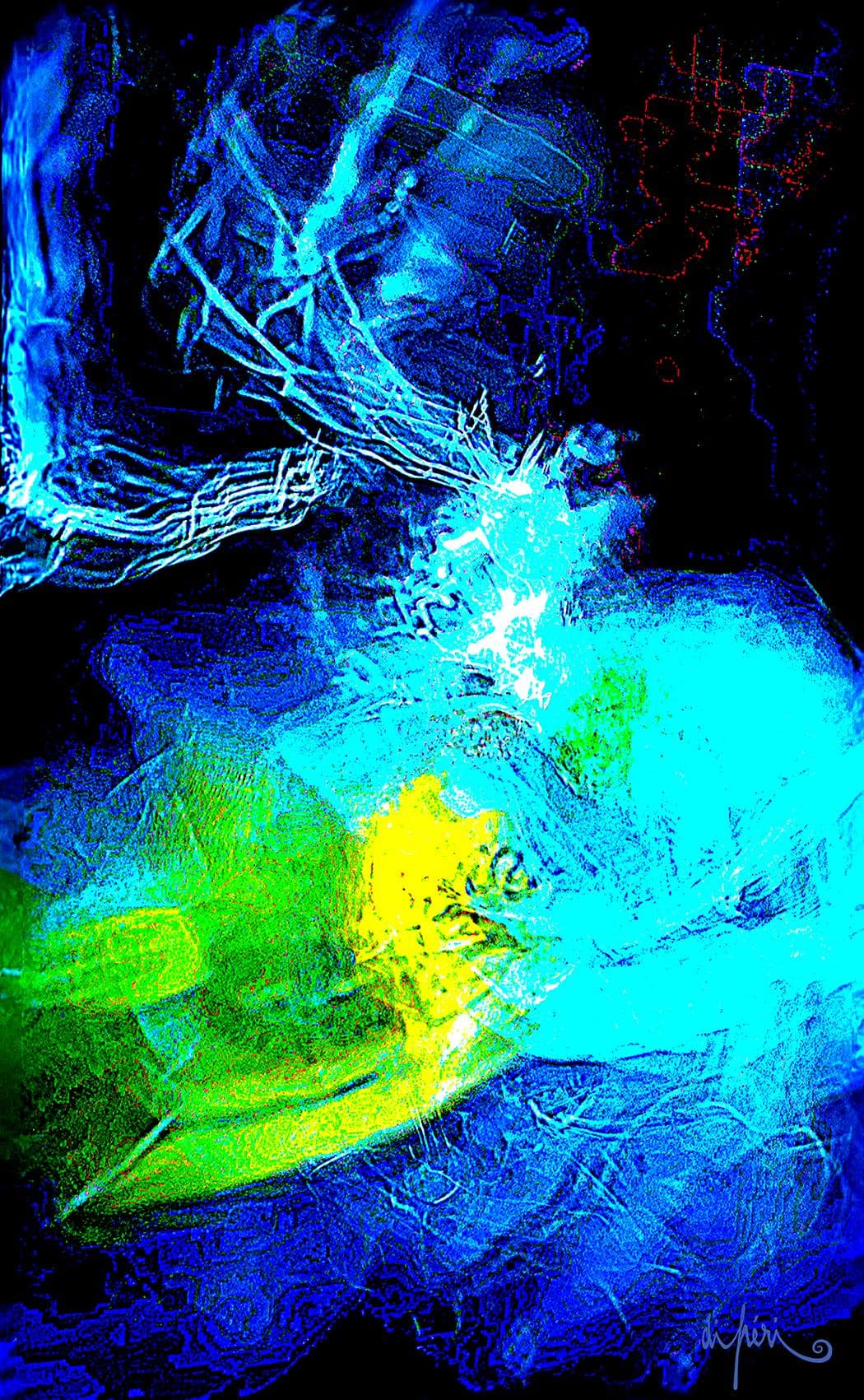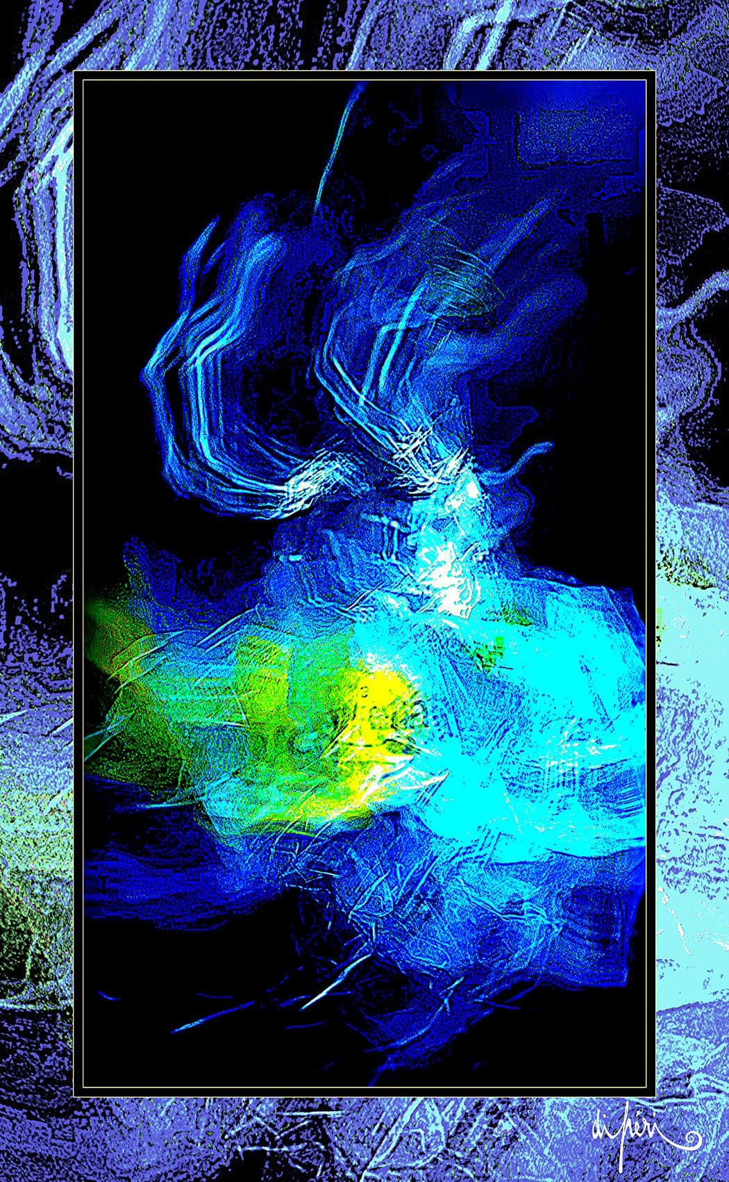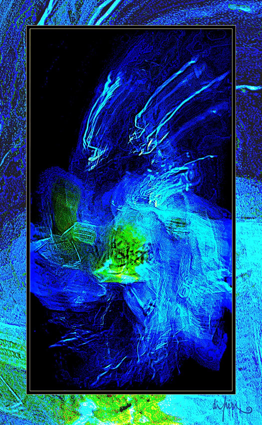 NOTA : tout comme les cadres, les reflets dus au plexiglas, qui n’est pas seulement une matière de protection, font partie intégrante de l’œuvre. Ils en prolongent et en surlignent le sens. Ils ont en charge de contextualiser l’effervescence présentielle de l’image. Le choix délibéré de cette matière de protection à effet miroir, suggère à elle seule, une mise en spatialité plus factuelle que virtuelle.