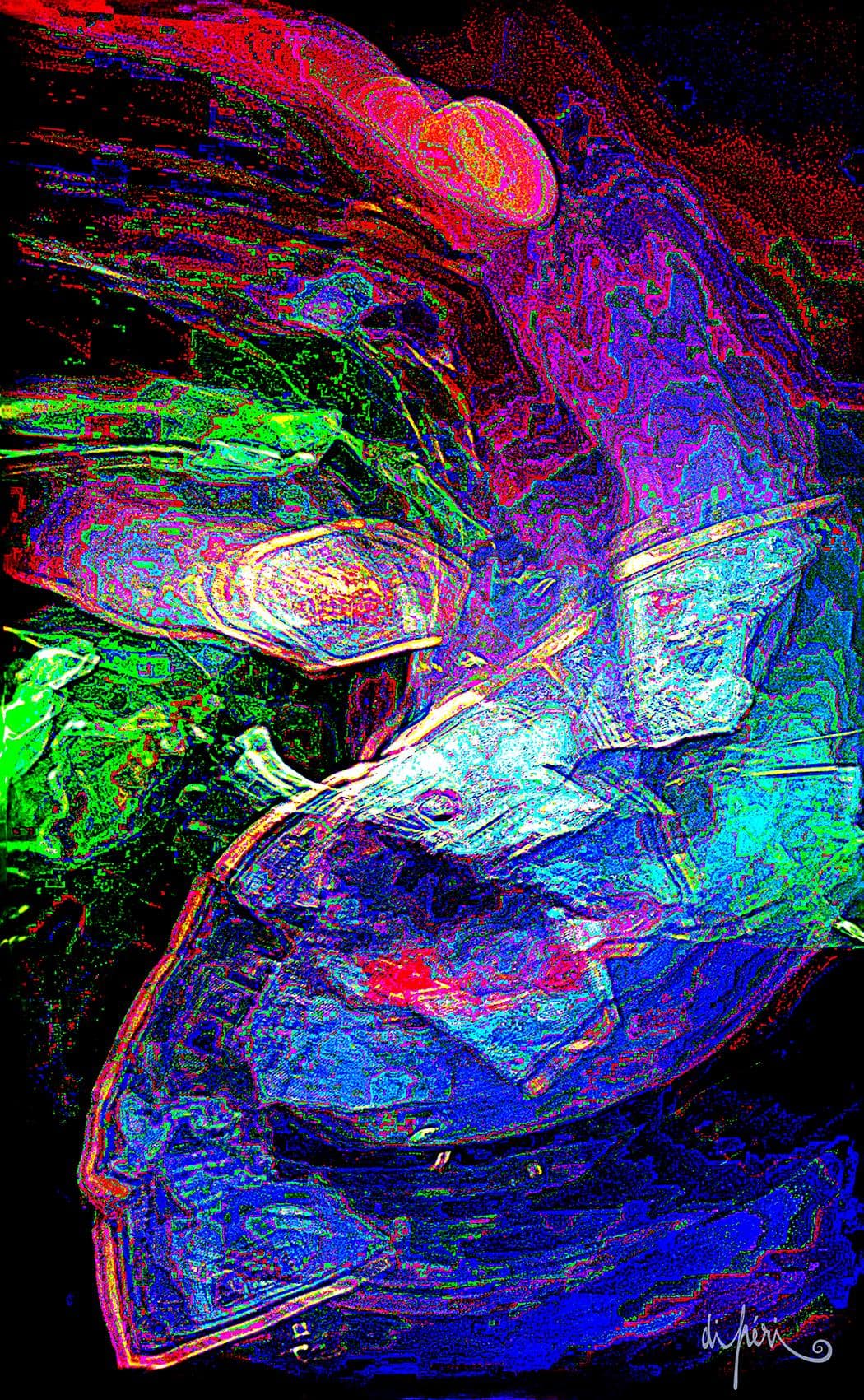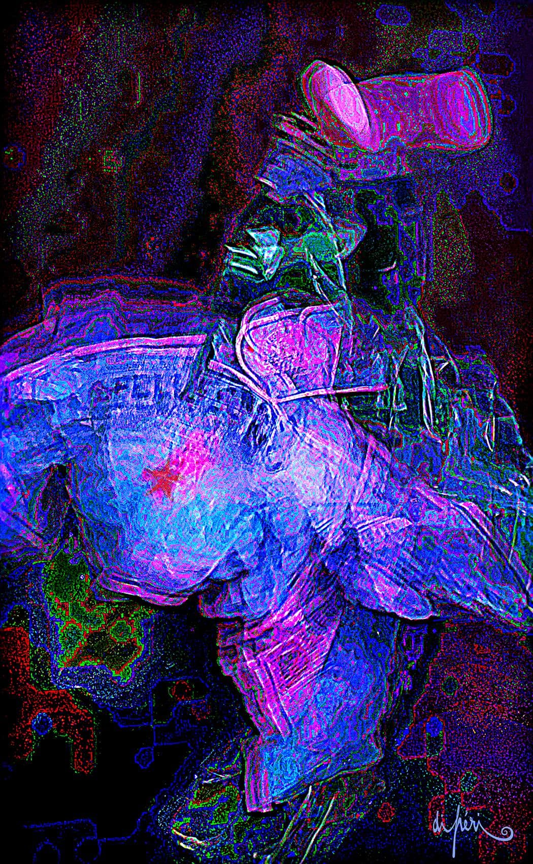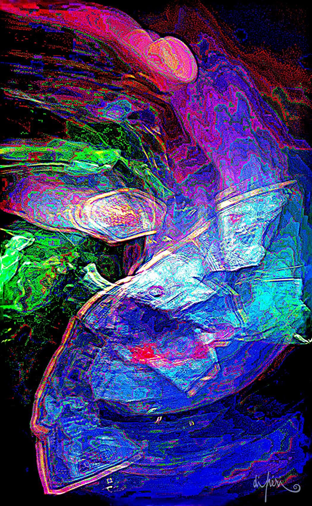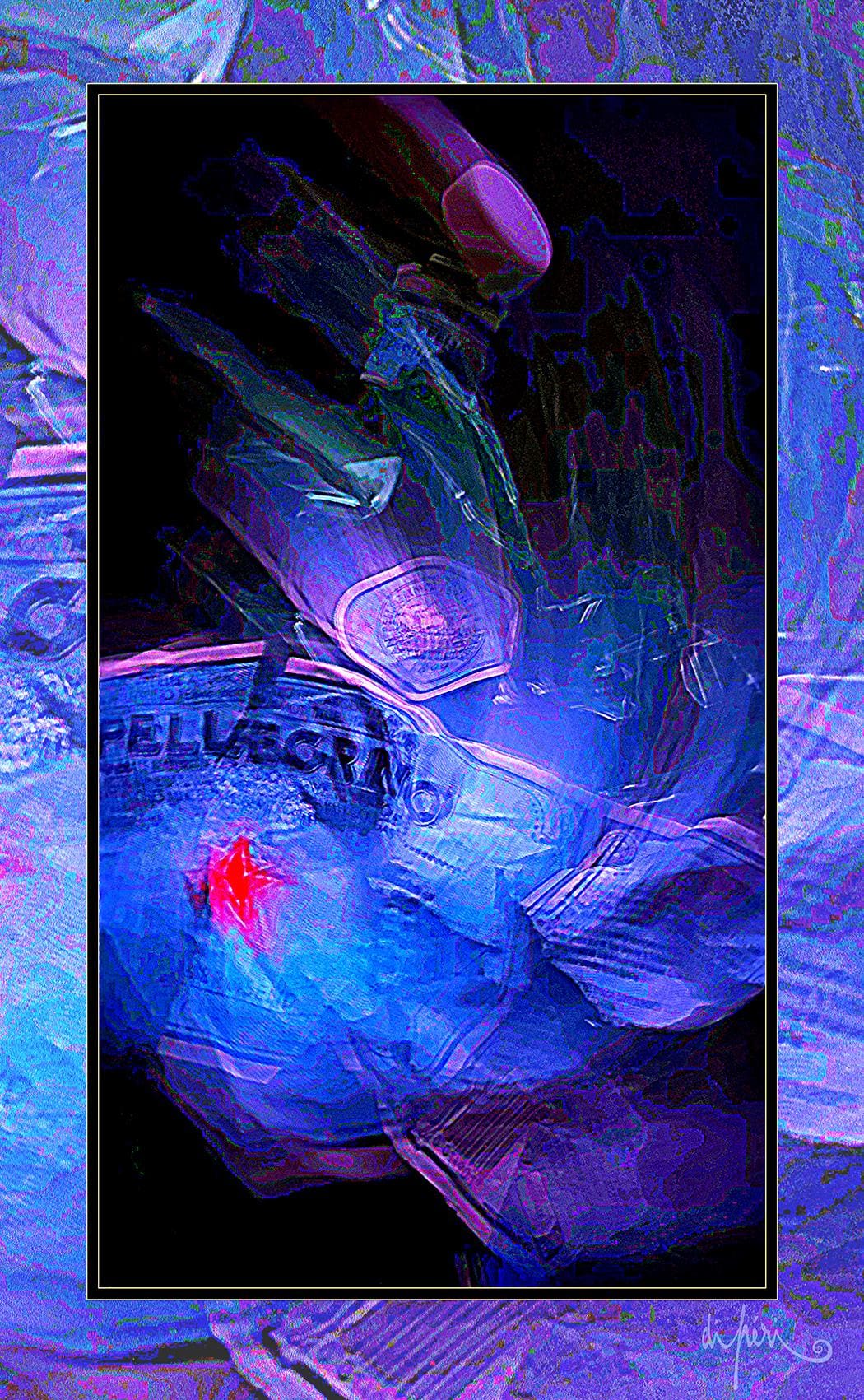 NOTA : tout comme les cadres, les reflets dus au plexiglas, qui n’est pas seulement une matière de protection, font partie intégrante de l’œuvre. Ils en prolongent et en surlignent le sens. Ils ont en charge de contextualiser l’effervescence présentielle de l’image. Le choix délibéré de cette matière de protection à effet miroir, suggère à elle seule, une mise en spatialité plus factuelle que virtuelle.