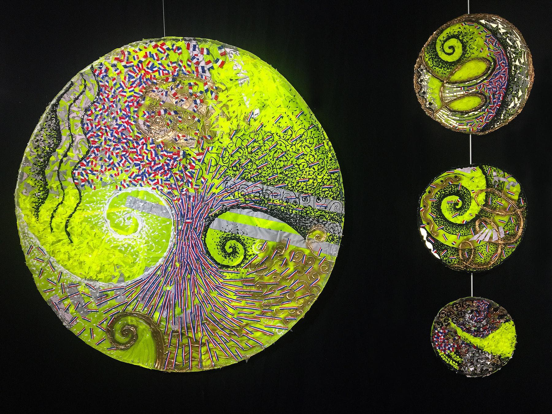 Il s’agira de grandes structures de métal en forme de spirales cycloniques : structure en double hélices d’ADN (effet tornade – voir croquis) recouvertes d’une composition élaborée à partir de gilets jaunes.