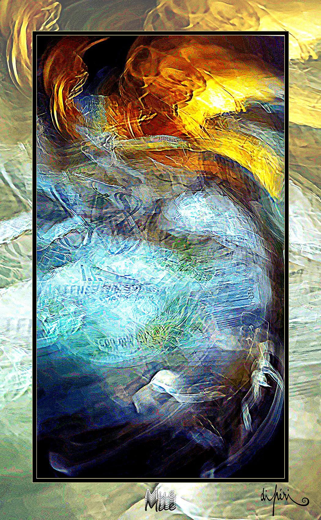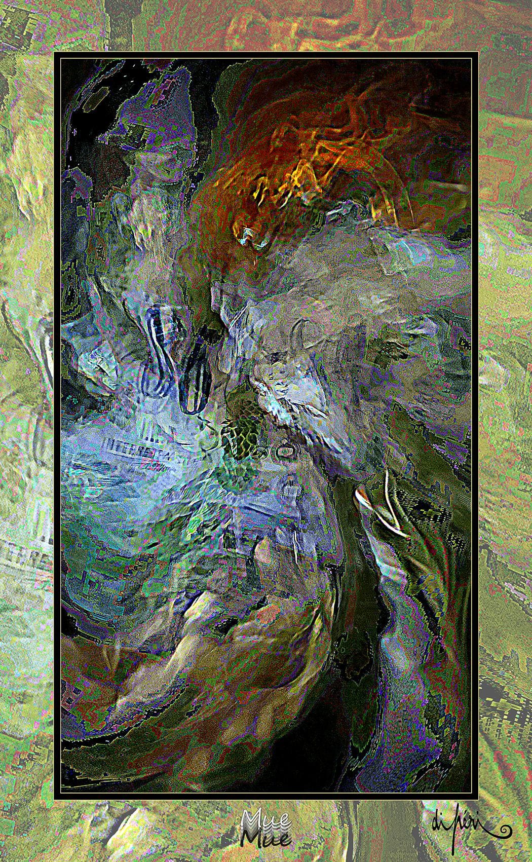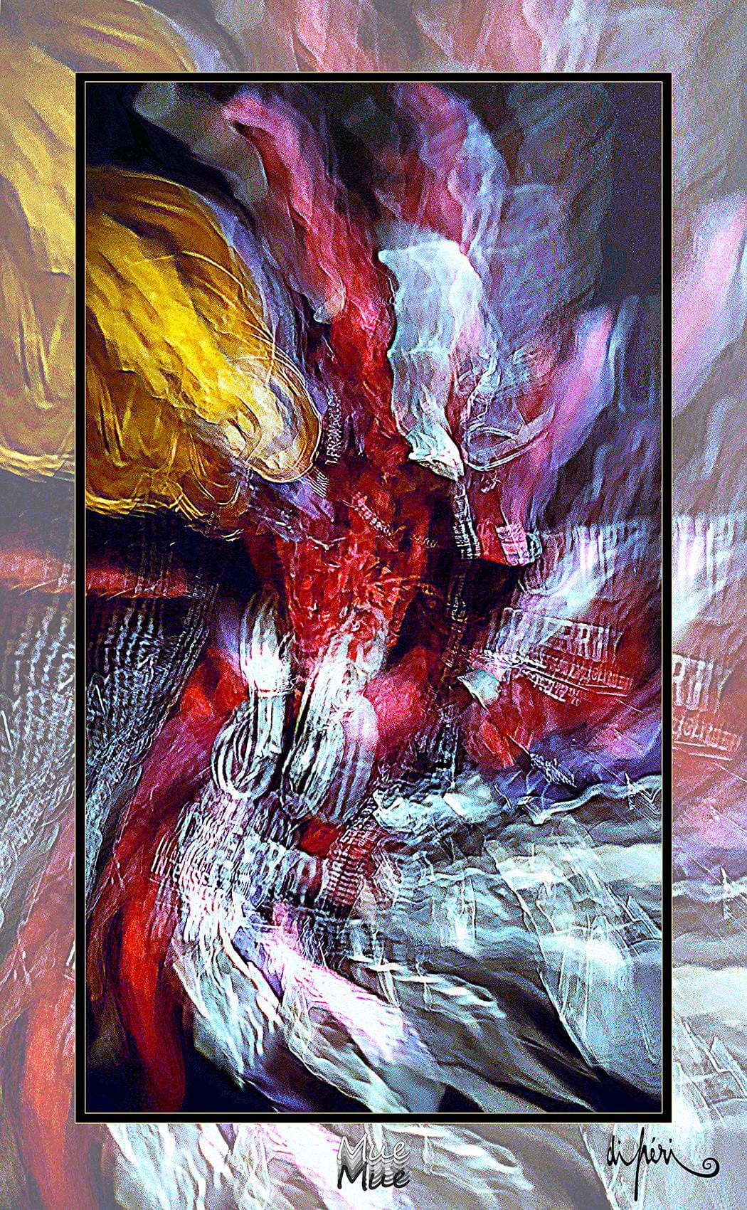 NOTA : tout comme les cadres, les reflets dus au plexiglas, qui n’est pas seulement une matière de protection, font partie intégrante de l’œuvre. Ils en prolongent et en surlignent le sens. Ils ont en charge de contextualiser l’effervescence présentielle de l’image. Le choix délibéré de cette matière de protection à effet miroir, suggère à elle seule, une mise en spatialité plus factuelle que virtuelle.