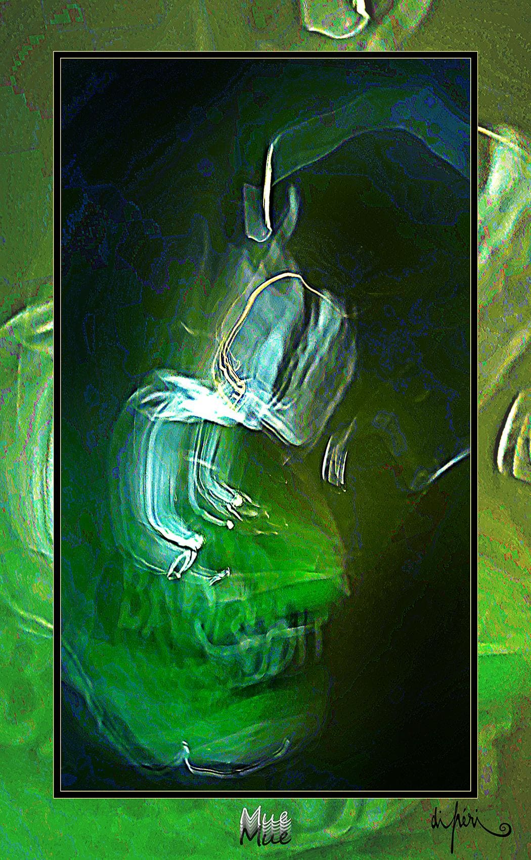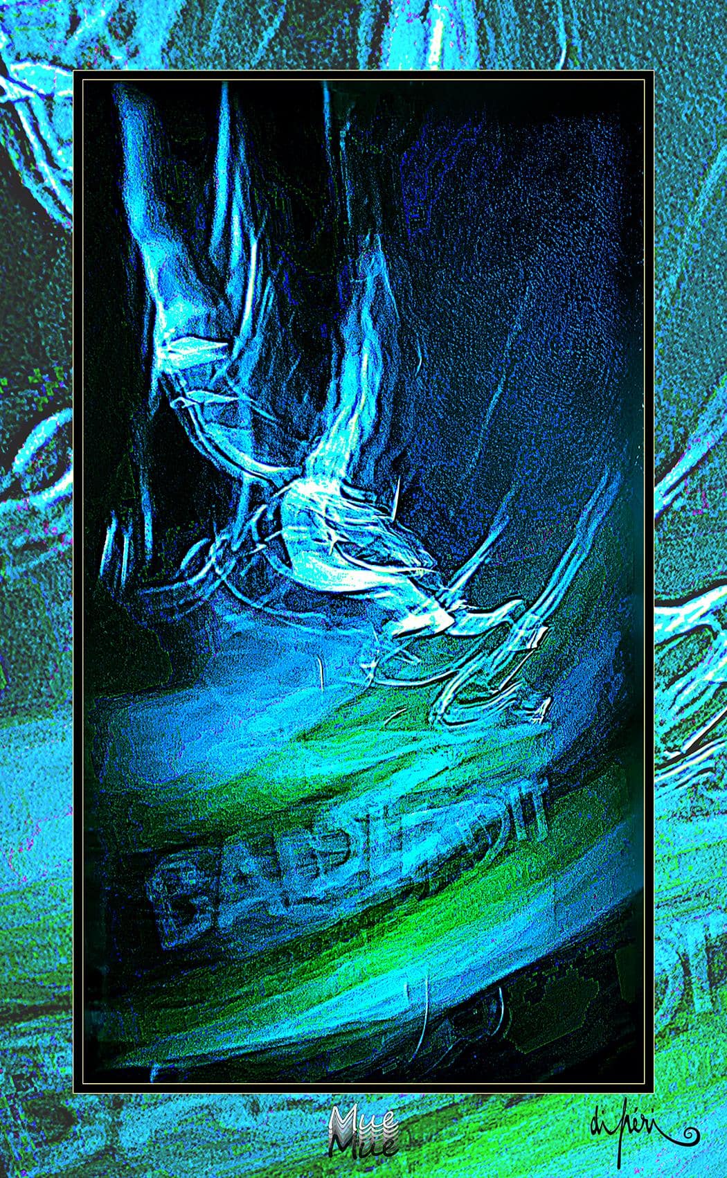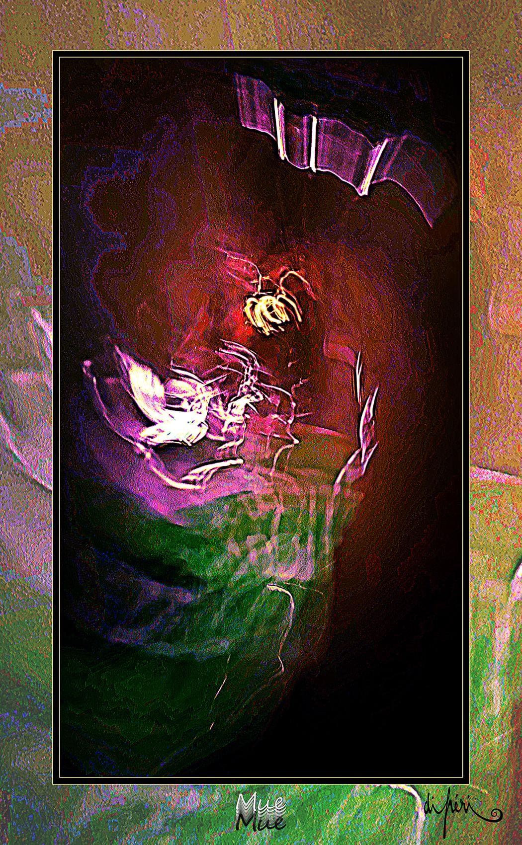 NOTA : tout comme les cadres, les reflets dus au plexiglas, qui n’est pas seulement une matière de protection, font partie intégrante de l’œuvre. Ils en prolongent et en surlignent le sens. Ils ont en charge de contextualiser l’effervescence présentielle de l’image. Le choix délibéré de cette matière de protection à effet miroir, suggère à elle seule, une mise en spatialité plus factuelle que virtuelle.
