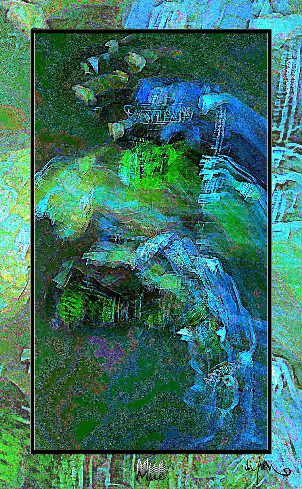 NOTA : tout comme les cadres, les reflets dus au plexiglas, qui n’est pas seulement une matière de protection, font partie intégrante de l’œuvre. Ils en prolongent et en surlignent le sens. Ils ont en charge de contextualiser l’effervescence présentielle de l’image. Le choix délibéré de cette matière de protection à effet miroir, suggère à elle seule, une mise en spatialité plus factuelle que virtuelle.