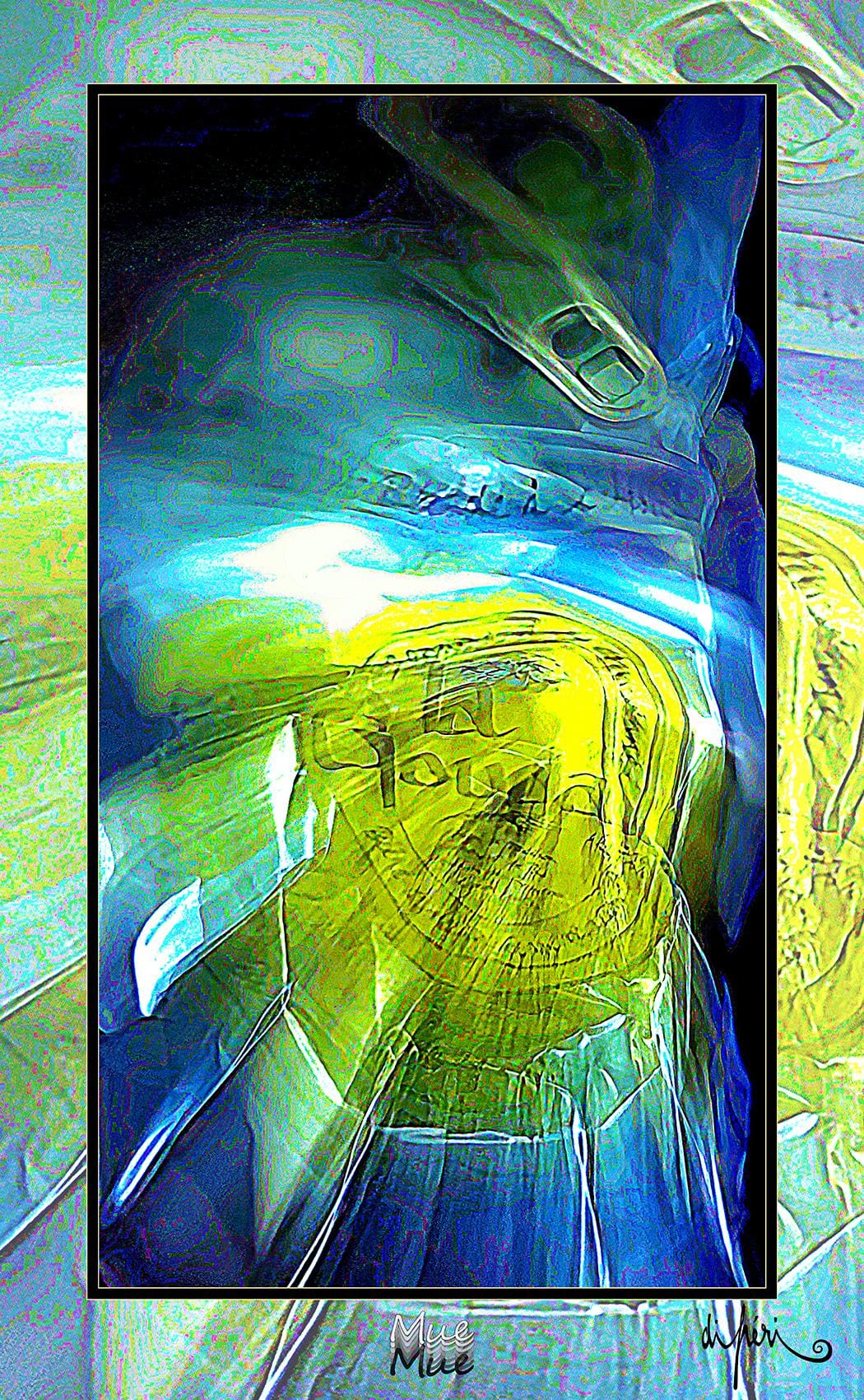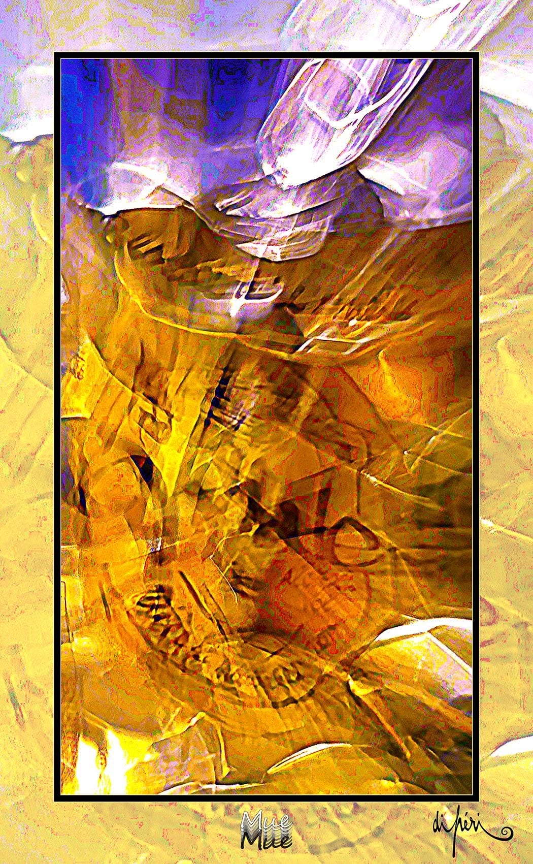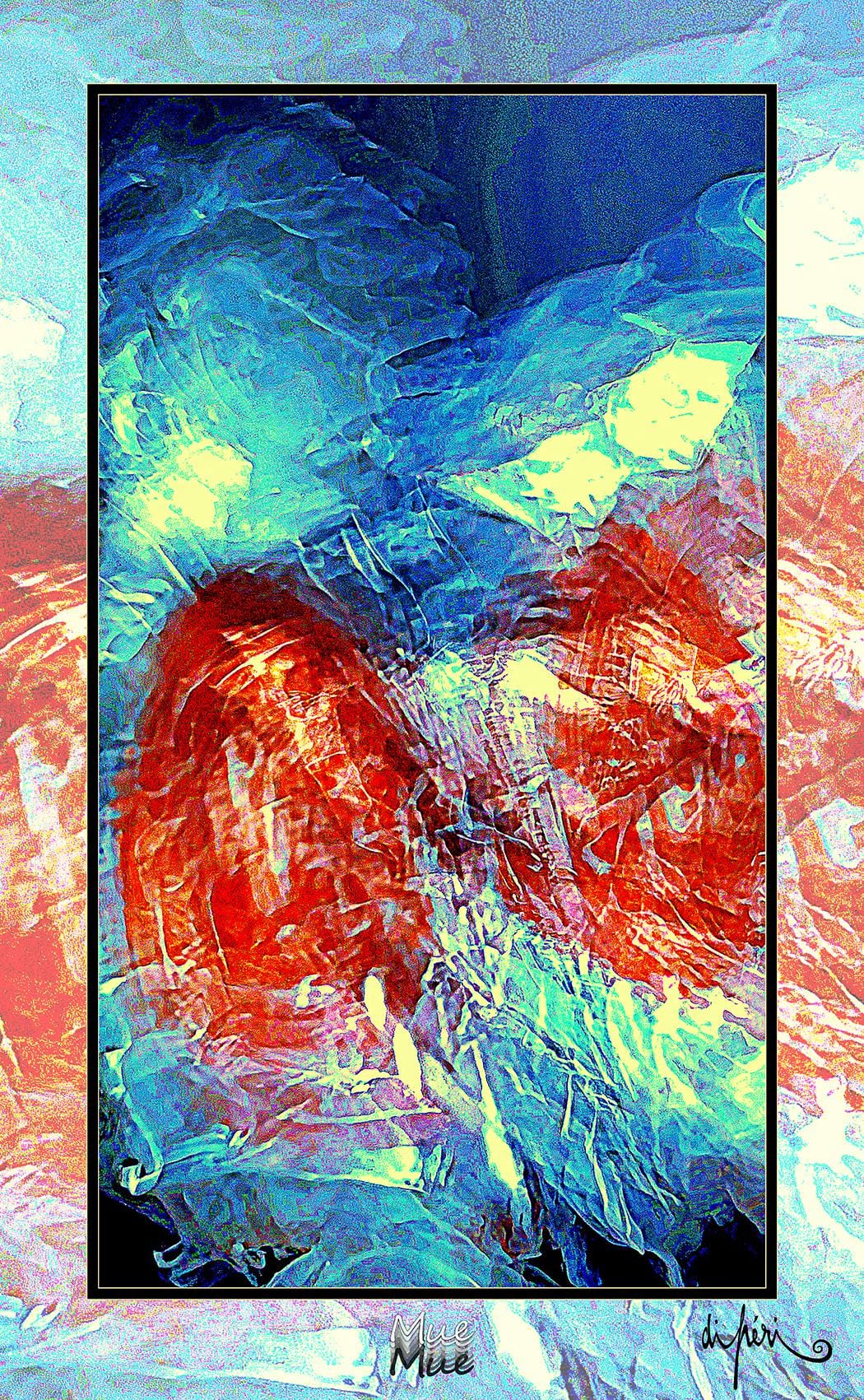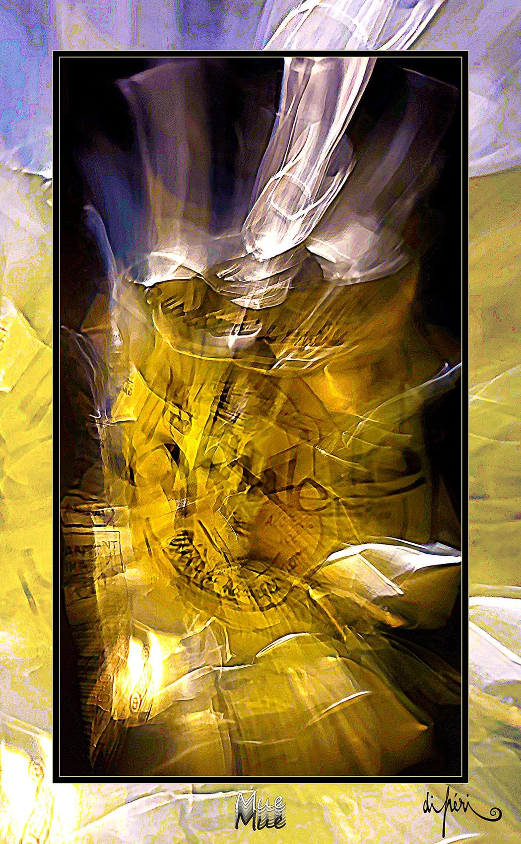 NOTA : tout comme les cadres, les reflets dus au plexiglas, qui n’est pas seulement une matière de protection, font partie intégrante de l’œuvre. Ils en prolongent et en surlignent le sens. Ils ont en charge de contextualiser l’effervescence présentielle de l’image. Le choix délibéré de cette matière de protection à effet miroir, suggère à elle seule, une mise en spatialité plus factuelle que virtuelle.