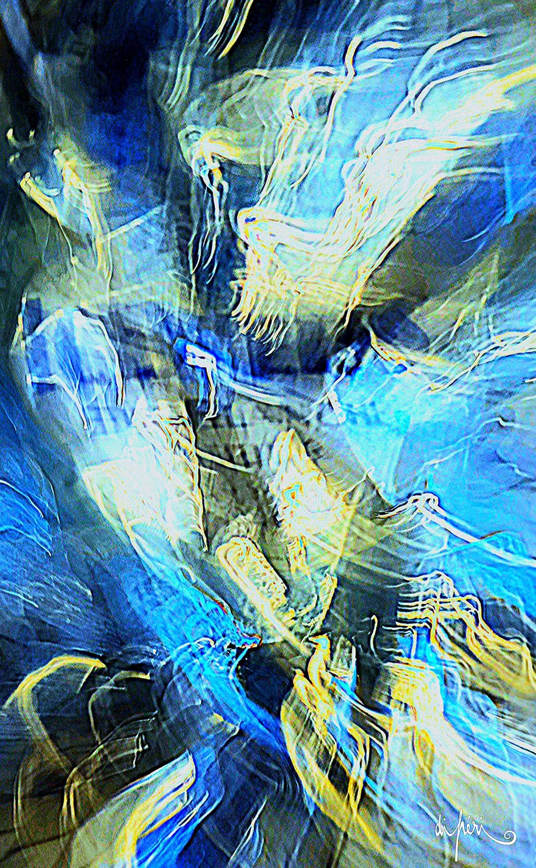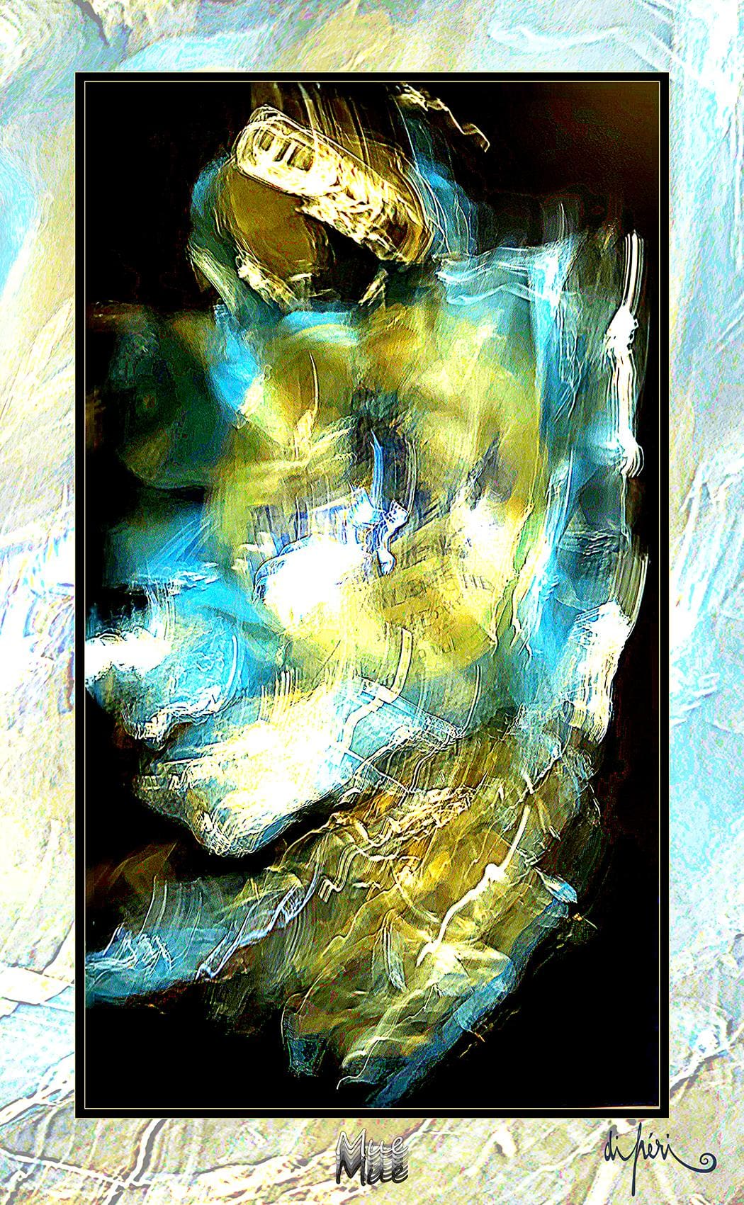 NOTA : tout comme les cadres, les reflets dus au plexiglas, qui n’est pas seulement une matière de protection, font partie intégrante de l’œuvre. Ils en prolongent et en surlignent le sens. Ils ont en charge de contextualiser l’effervescence présentielle de l’image. Le choix délibéré de cette matière de protection à effet miroir, suggère à elle seule, une mise en spatialité plus factuelle que virtuelle.