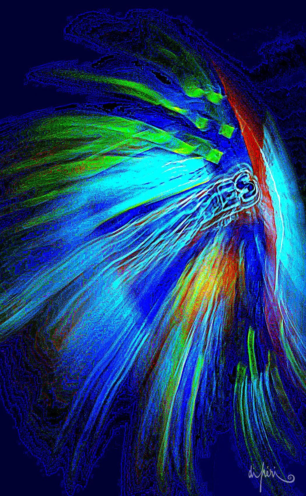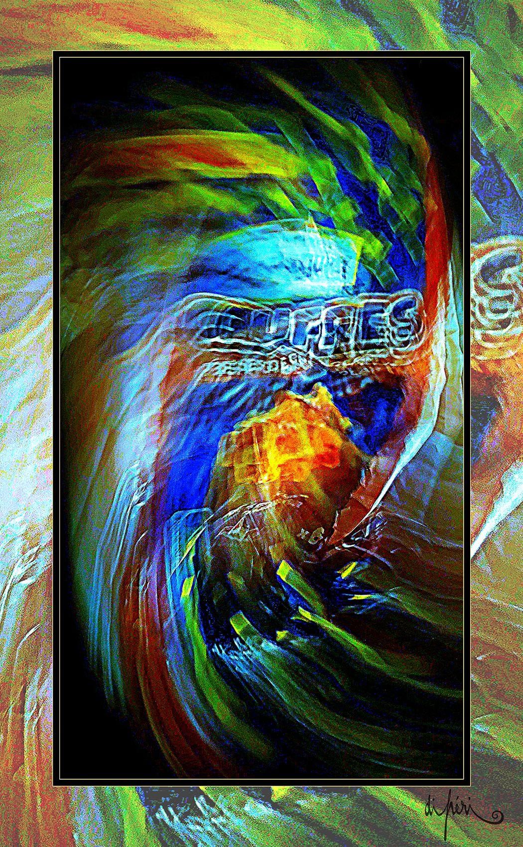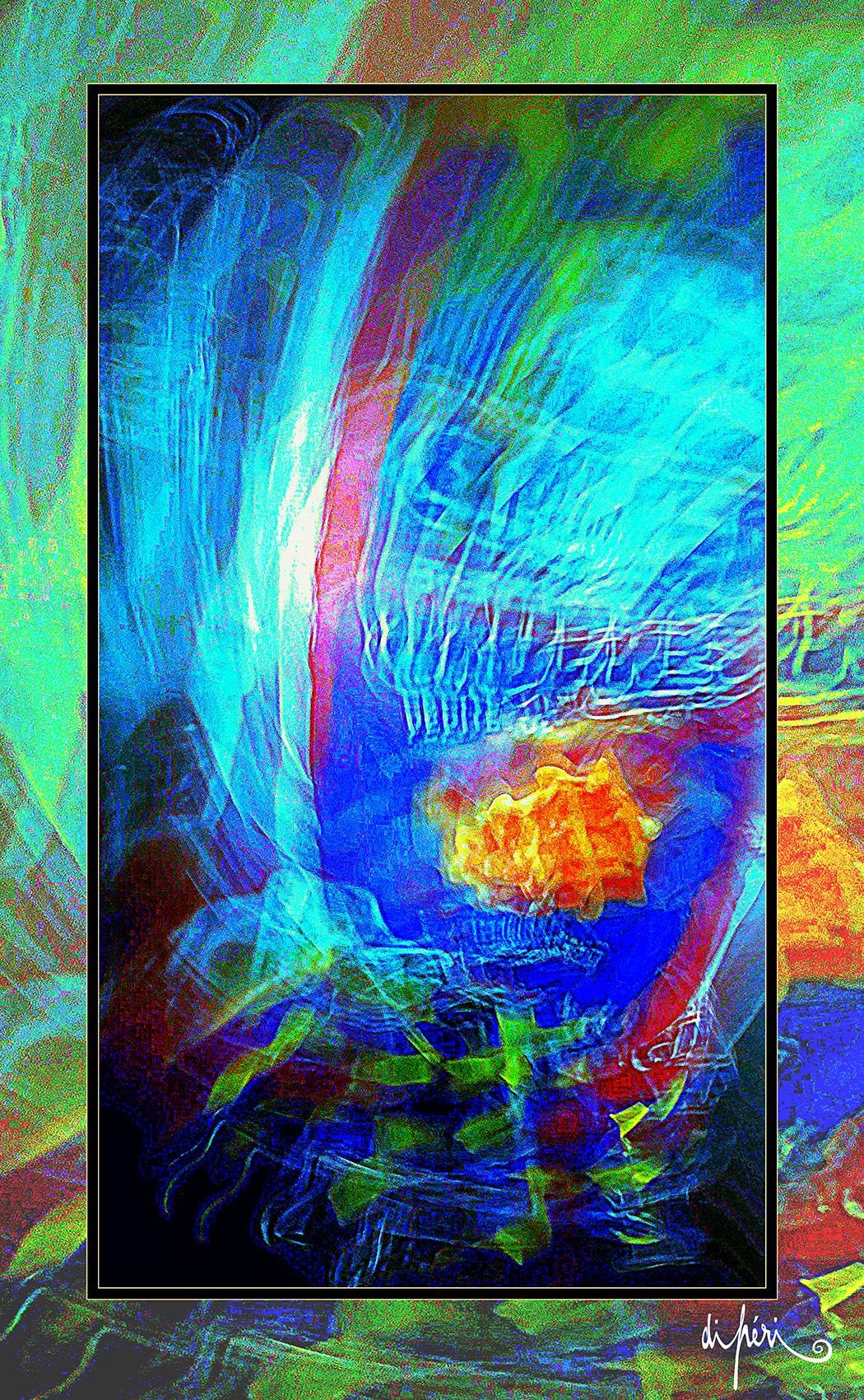 NOTA : tout comme les cadres, les reflets dus au plexiglas, qui n’est pas seulement une matière de protection, font partie intégrante de l’œuvre. Ils en prolongent et en surlignent le sens. Ils ont en charge de contextualiser l’effervescence présentielle de l’image. Le choix délibéré de cette matière de protection à effet miroir, suggère à elle seule, une mise en spatialité plus factuelle que virtuelle.