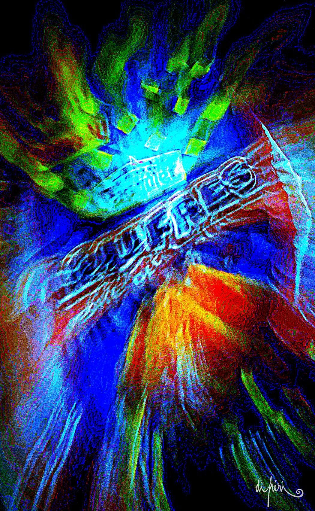 NOTA : tout comme les cadres, les reflets dus au plexiglas, qui n’est pas seulement une matière de protection, font partie intégrante de l’œuvre. Ils en prolongent et en surlignent le sens. Ils ont en charge de contextualiser l’effervescence présentielle de l’image. Le choix délibéré de cette matière de protection à effet miroir, suggère à elle seule, une mise en spatialité plus factuelle que virtuelle.