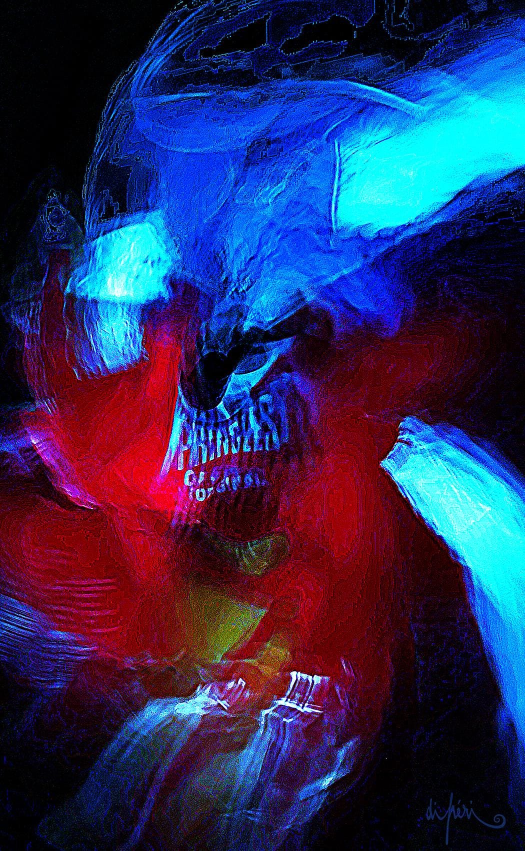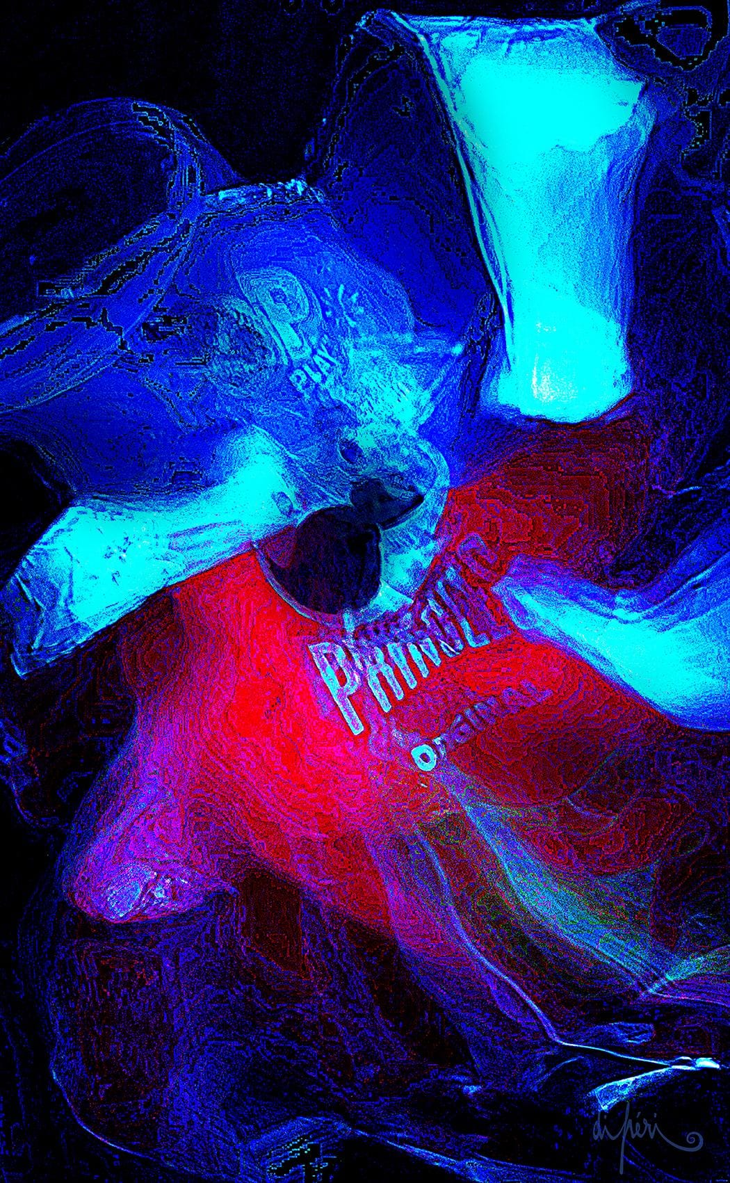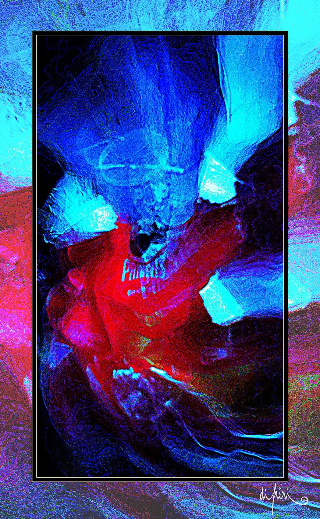 NOTA : tout comme les cadres, les reflets dus au plexiglas, qui n’est pas seulement une matière de protection, font partie intégrante de l’œuvre. Ils en prolongent et en surlignent le sens. Ils ont en charge de contextualiser l’effervescence présentielle de l’image. Le choix délibéré de cette matière de protection à effet miroir, suggère à elle seule, une mise en spatialité plus factuelle que virtuelle.