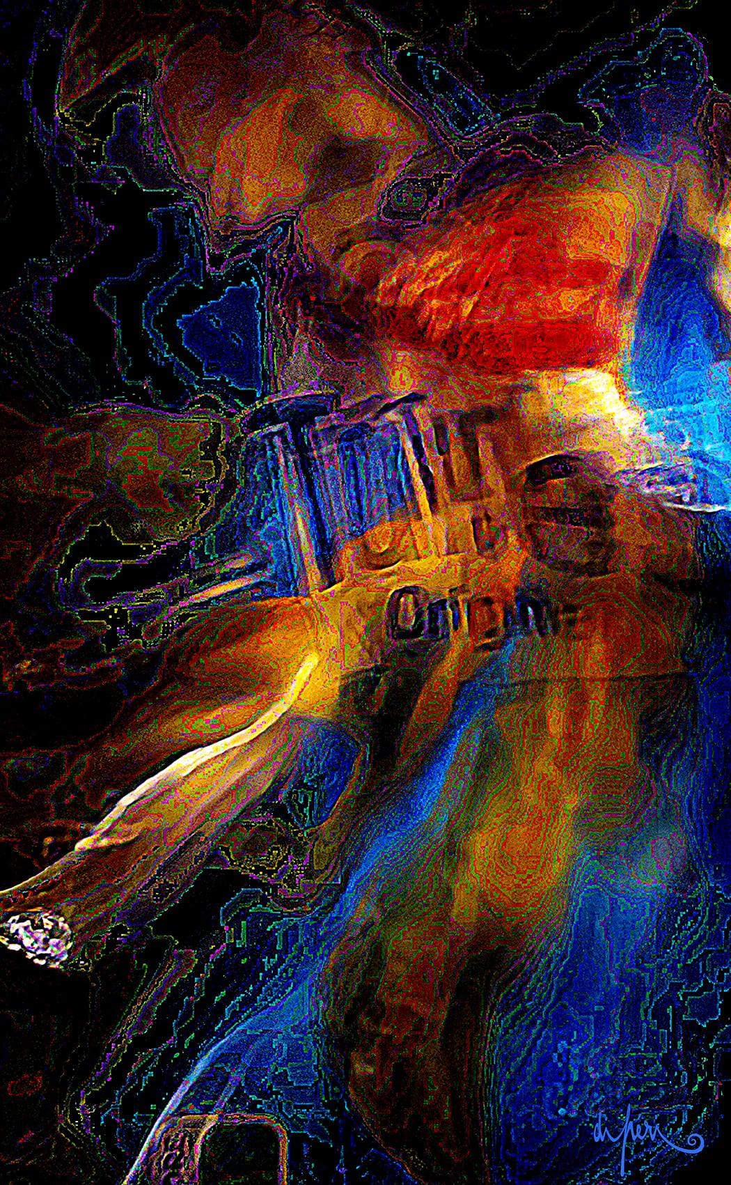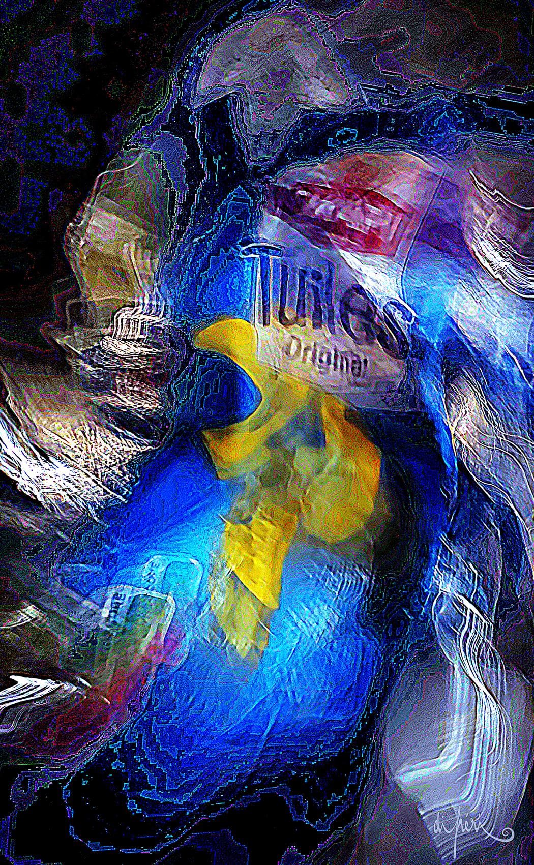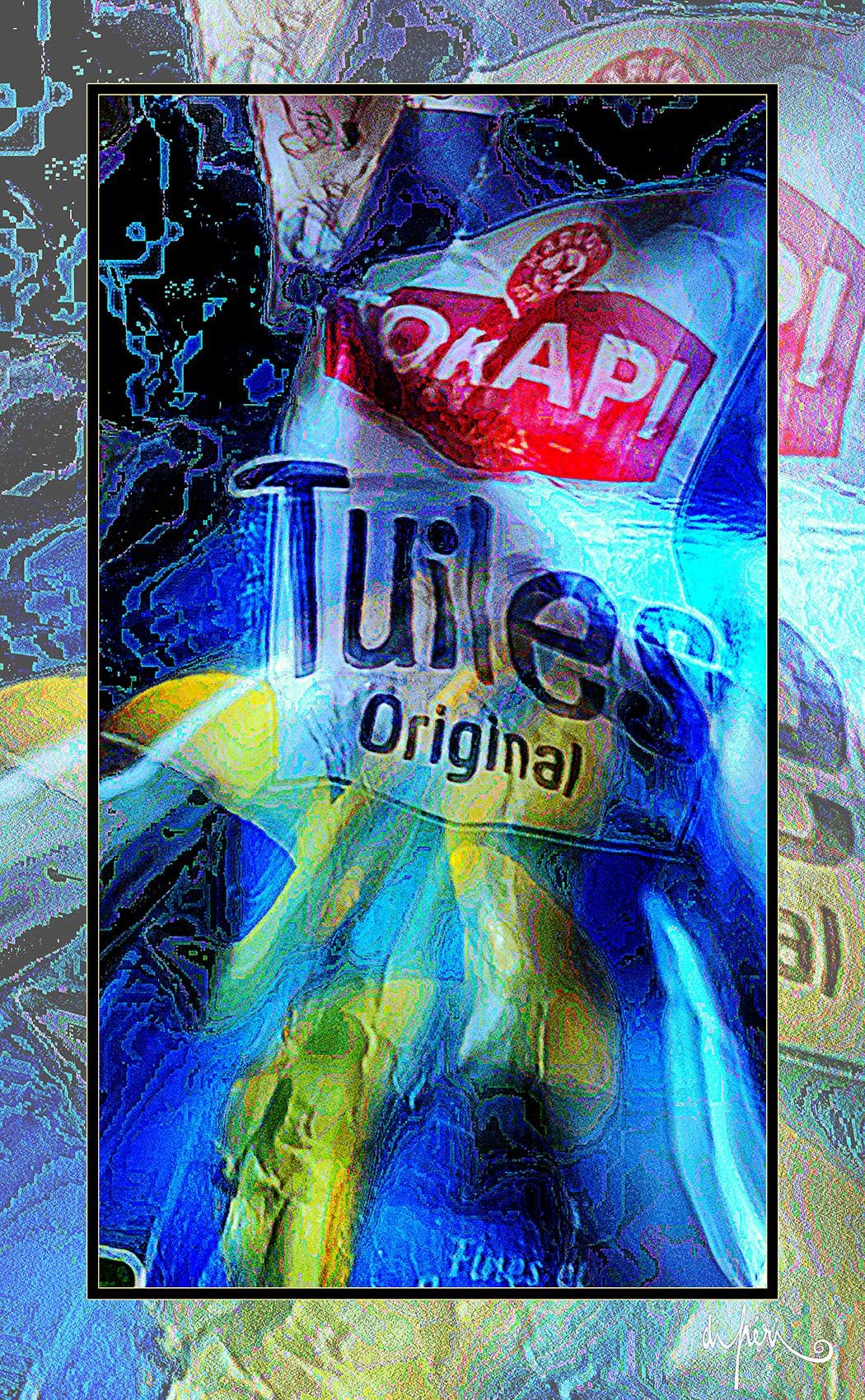 NOTA : tout comme les cadres, les reflets dus au plexiglas, qui n’est pas seulement une matière de protection, font partie intégrante de l’œuvre. Ils en prolongent et en surlignent le sens. Ils ont en charge de contextualiser l’effervescence présentielle de l’image. Le choix délibéré de cette matière de protection à effet miroir, suggère à elle seule, une mise en spatialité plus factuelle que virtuelle.