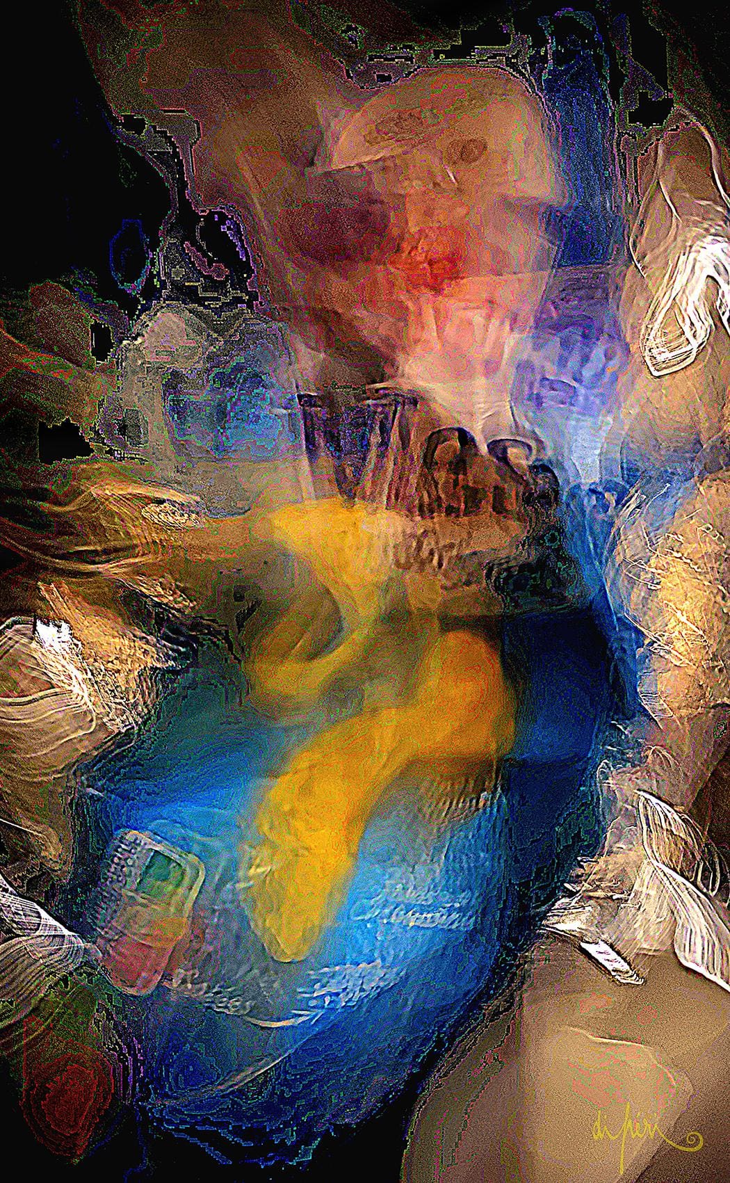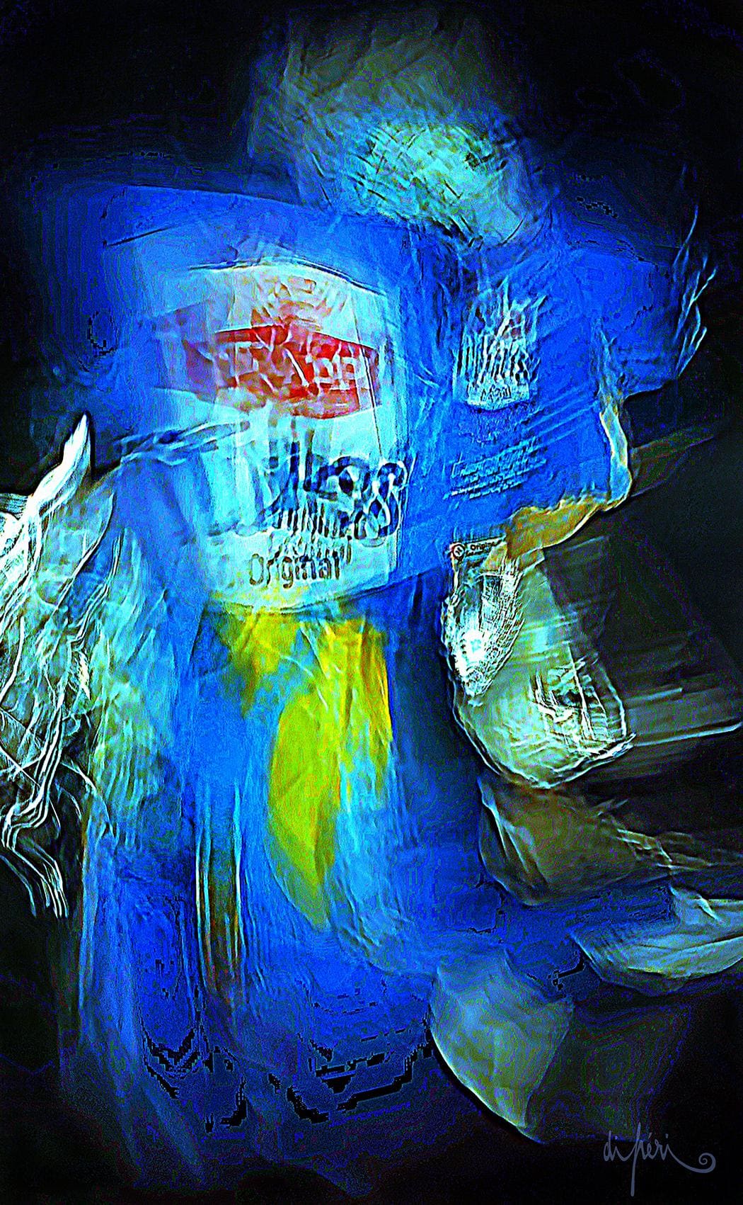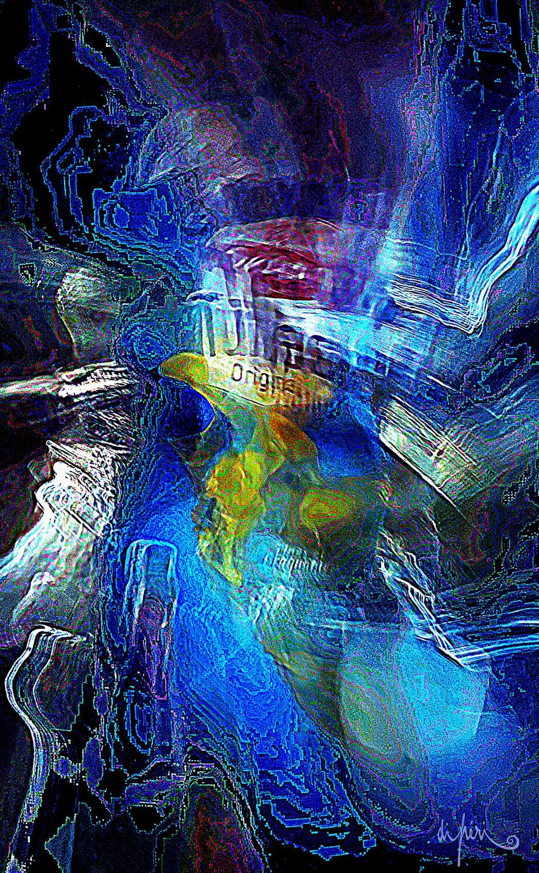 NOTA : tout comme les cadres, les reflets dus au plexiglas, qui n’est pas seulement une matière de protection, font partie intégrante de l’œuvre. Ils en prolongent et en surlignent le sens. Ils ont en charge de contextualiser l’effervescence présentielle de l’image. Le choix délibéré de cette matière de protection à effet miroir, suggère à elle seule, une mise en spatialité plus factuelle que virtuelle.
