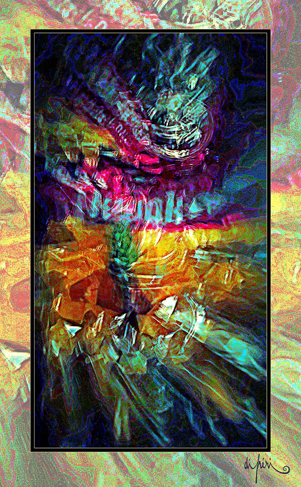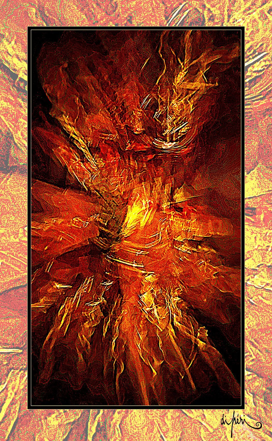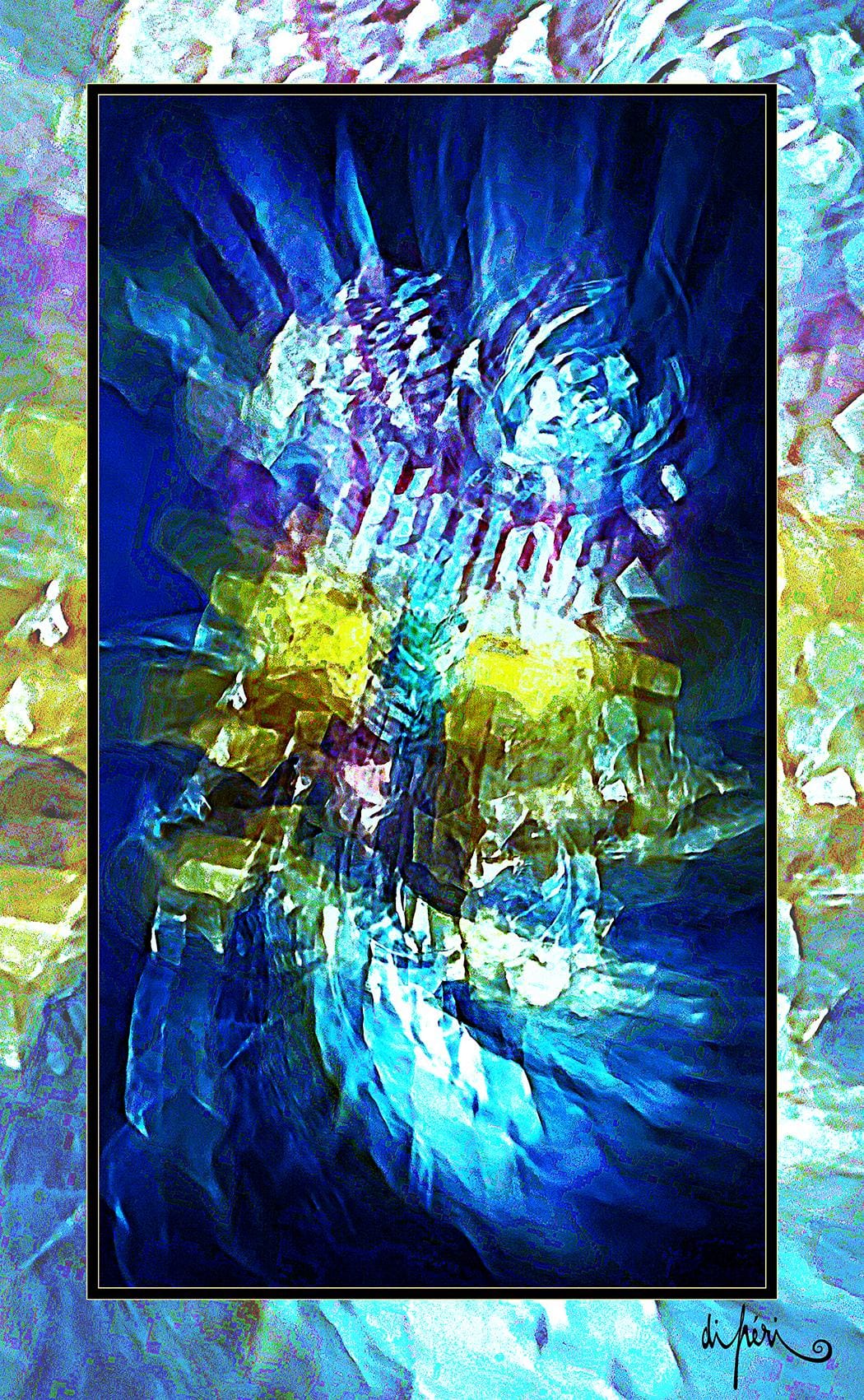 Although not mandatory, the frame is considered by the artist as potentially an integral part of the artwork. Certain compositions “call” for a subtle link with the environment and with the future. Like an echo, the frame adds symbolic depth and semiological intensity. Its “diffractive aura” surrounds the focal image with centrifugal resonance, evoking a form of already transitional lyrical act.