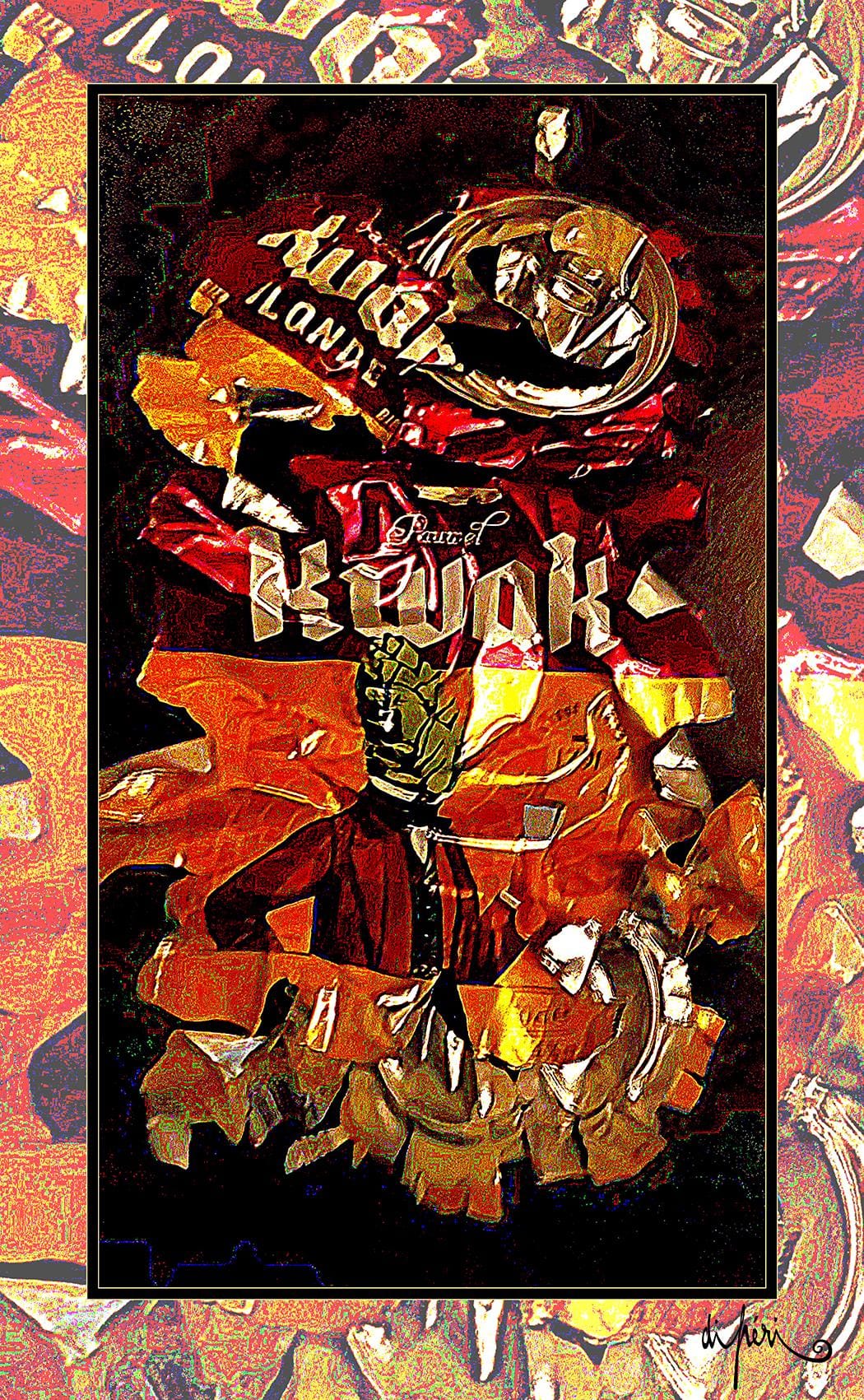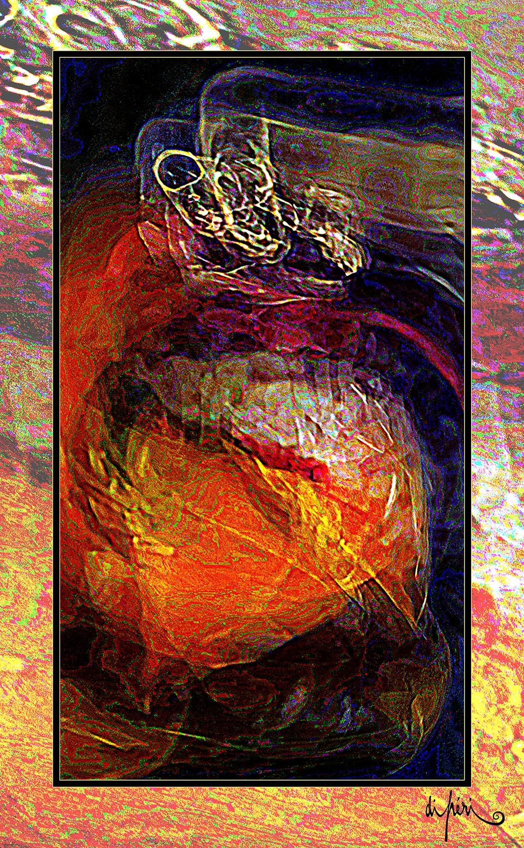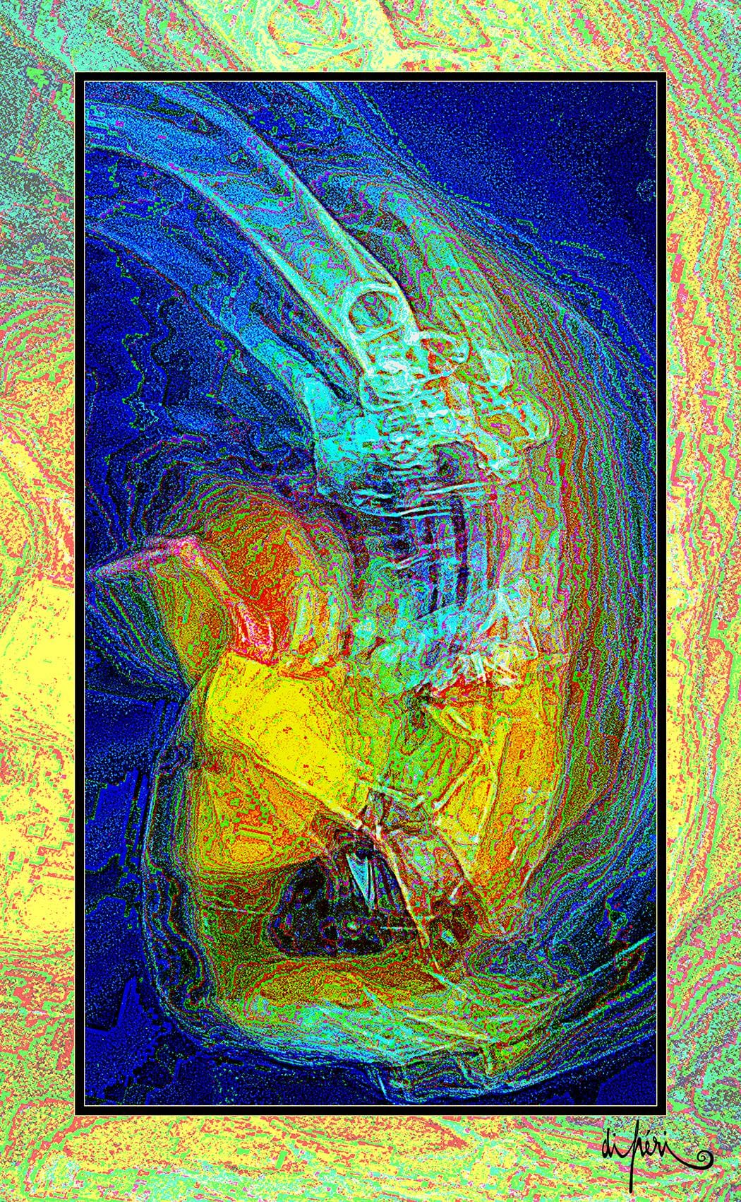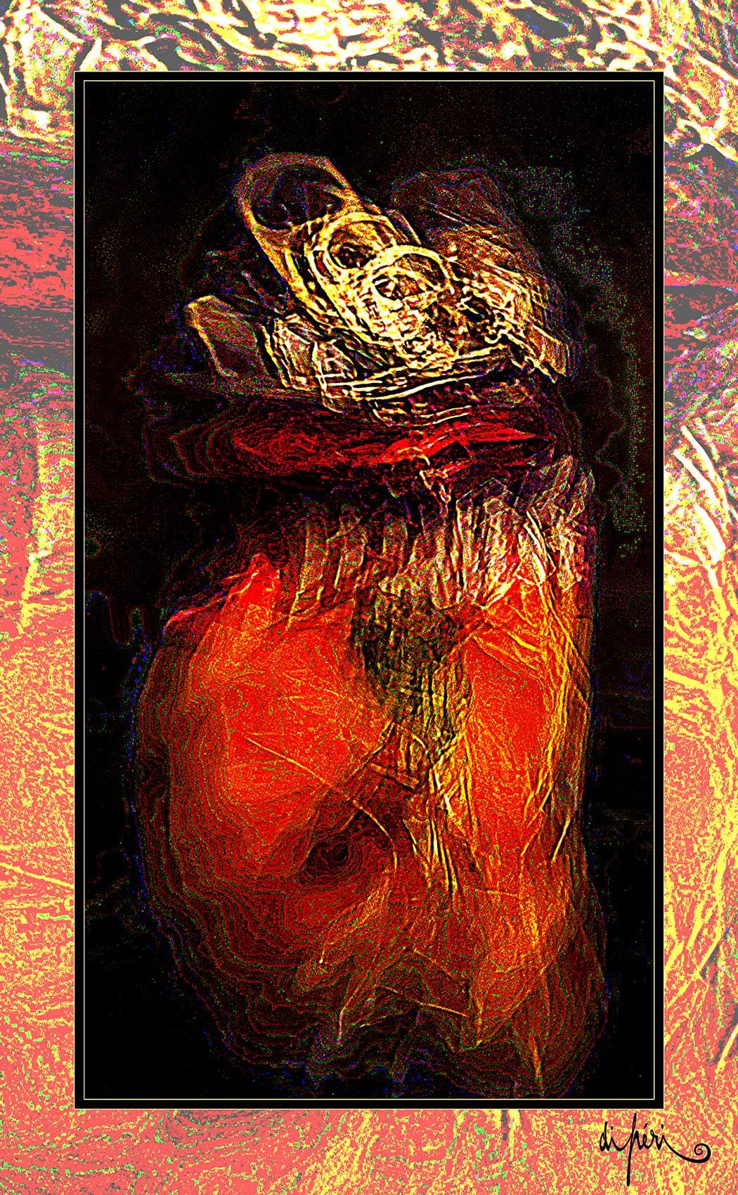 Although not mandatory, the frame is considered by the artist as potentially an integral part of the artwork. Certain compositions “call” for a subtle link with the environment and with the future. Like an echo, the frame adds symbolic depth and semiological intensity. Its “diffractive aura” surrounds the focal image with centrifugal resonance, evoking a form of already transitional lyrical act.