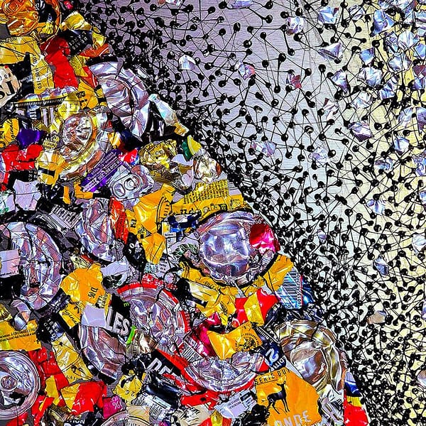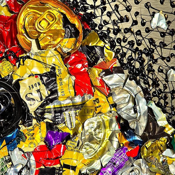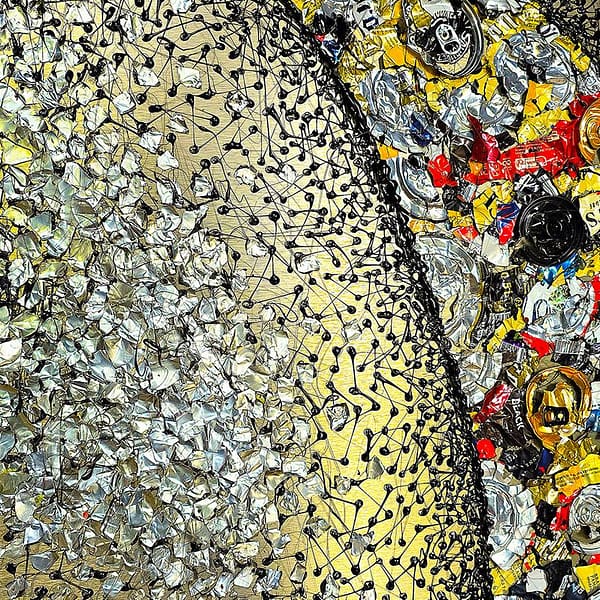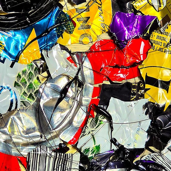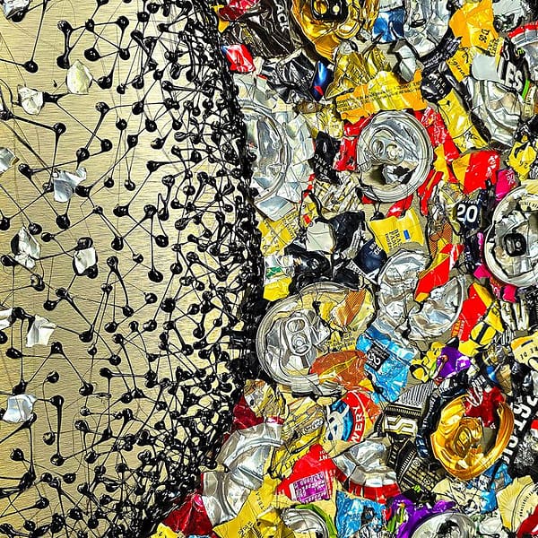 Mues speaks of the individual transformation of matter; Packchwork speaks of its collective recomposition. Together, they form a dialogue: from the introspective gaze of a single crushed can to the architectural energy of an entire surface built from hundreds.
