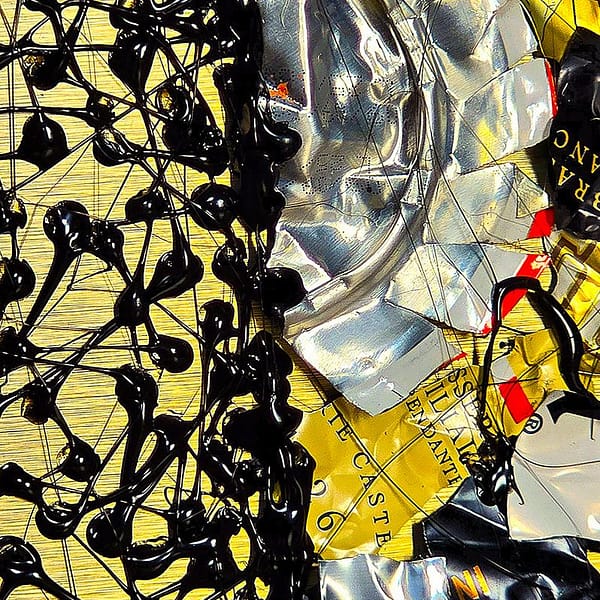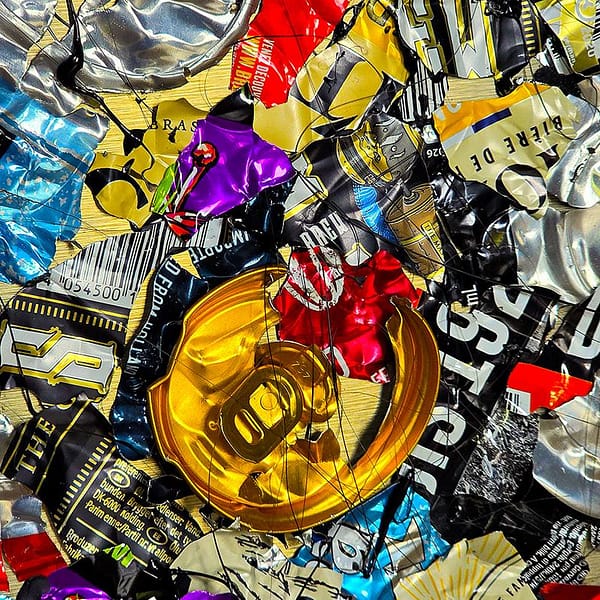 These large collages, born from the same raw material — aluminum cans, compressed boxes, remnants of everyday life — come together like pieces of an industrial puzzle. The title, a play on words between “patchwork” and “pack”, evokes both the handcrafted technique of assemblage and the popular reference to a “pack of beer” — an ironic nod to the overconsumption that fuels these works.