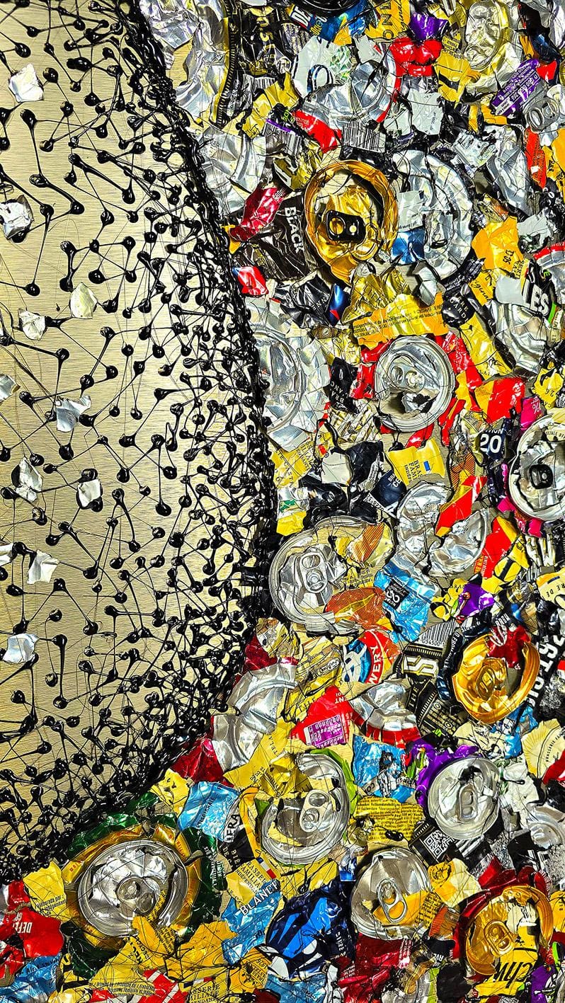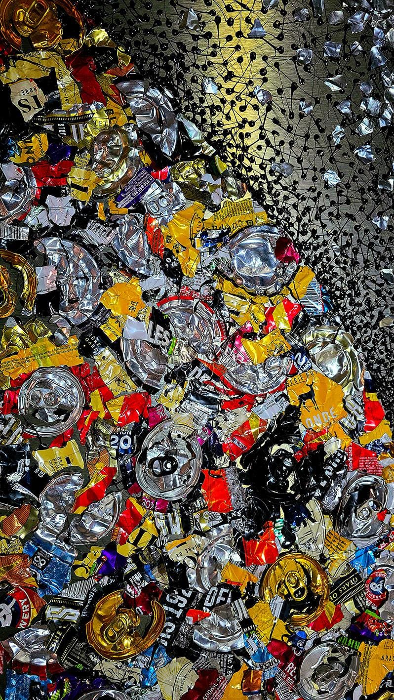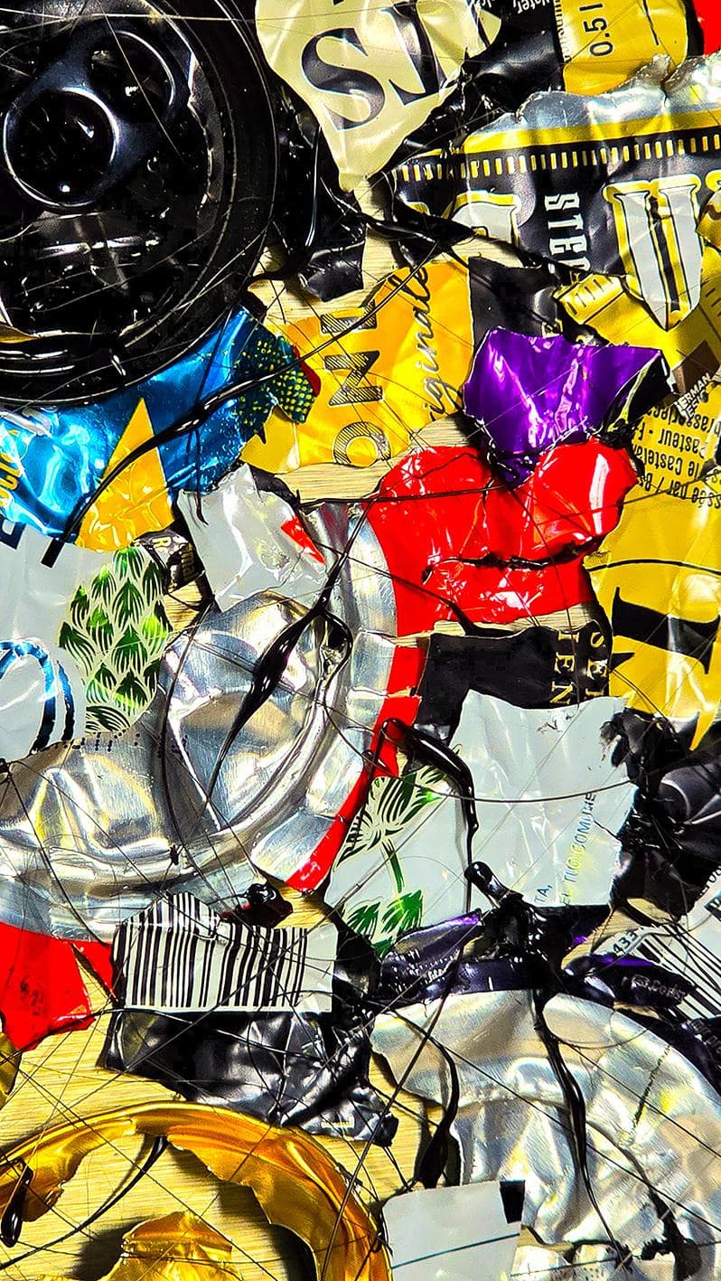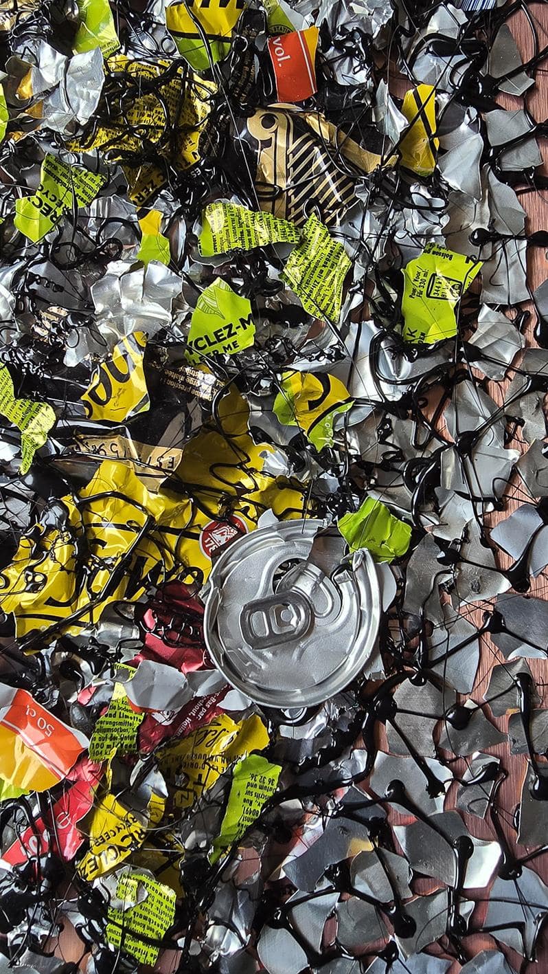 Mues speaks of the individual transformation of matter; Packchwork speaks of its collective recomposition. Together, they form a dialogue: from the introspective gaze of a single crushed can to the architectural energy of an entire surface built from hundreds.