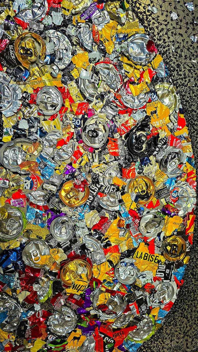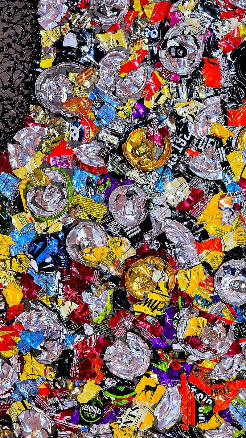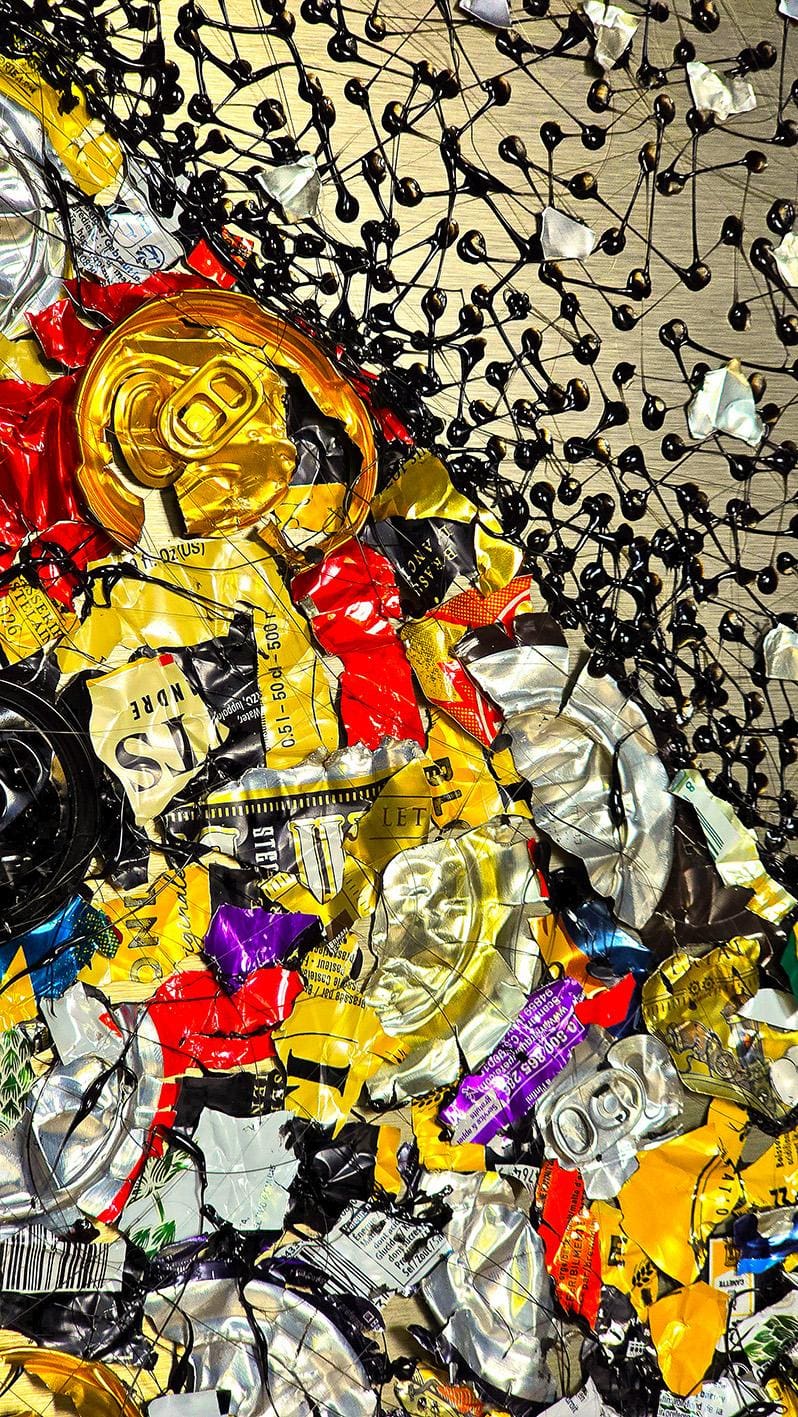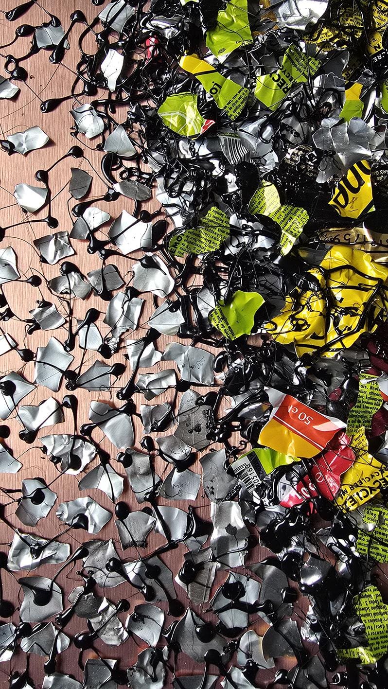 Mues speaks of the individual transformation of matter; Packchwork speaks of its collective recomposition. Together, they form a dialogue: from the introspective gaze of a single crushed can to the architectural energy of an entire surface built from hundreds.