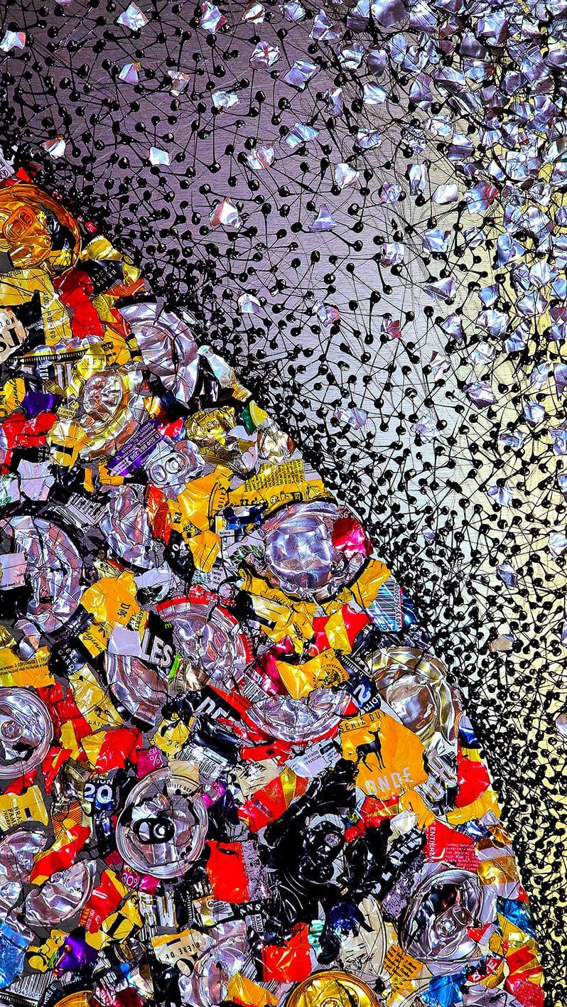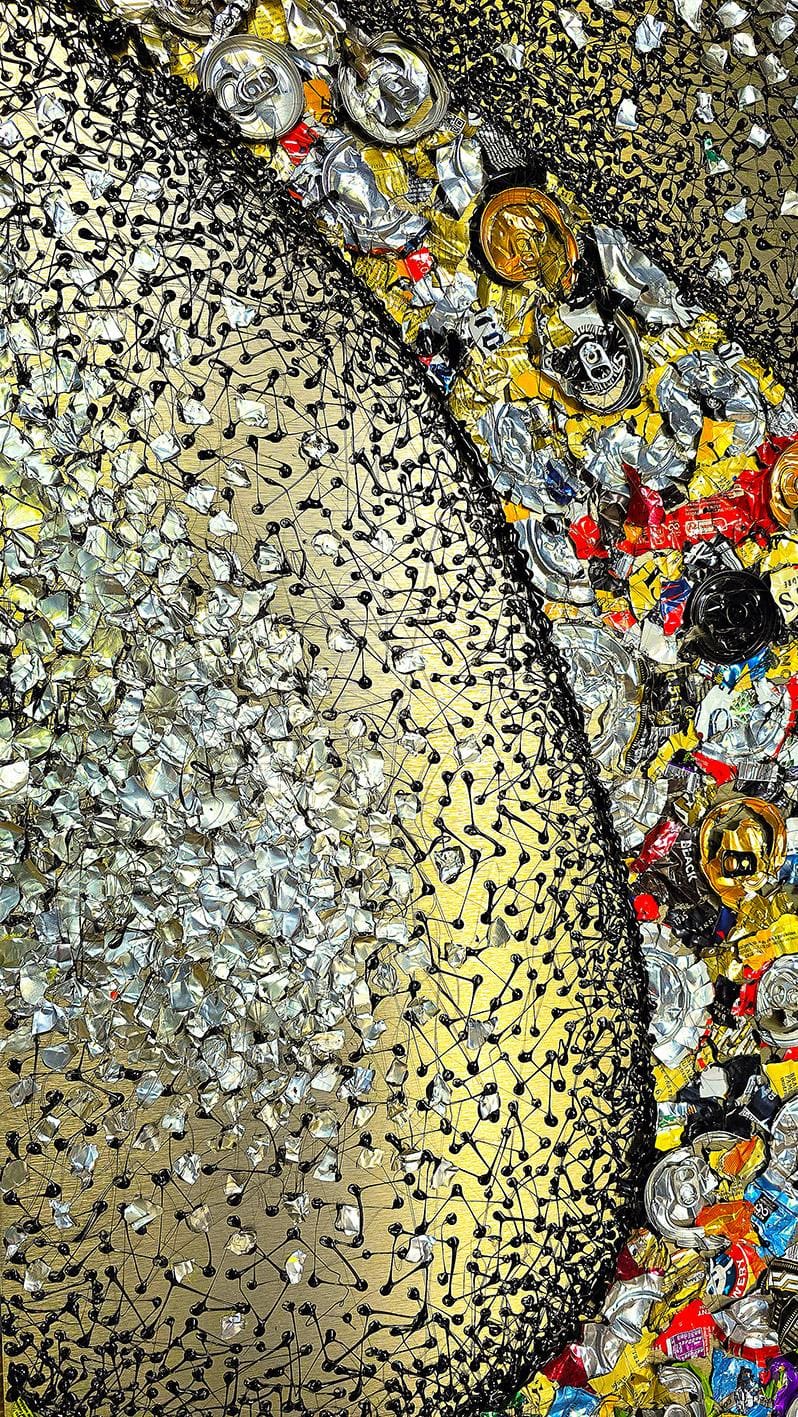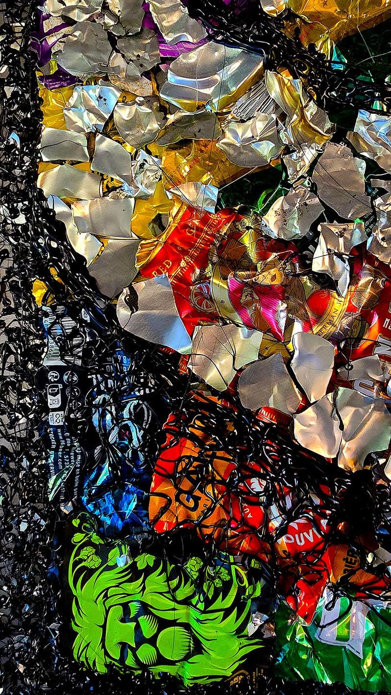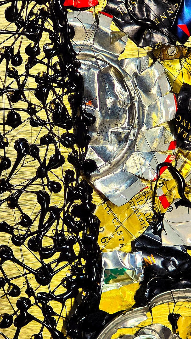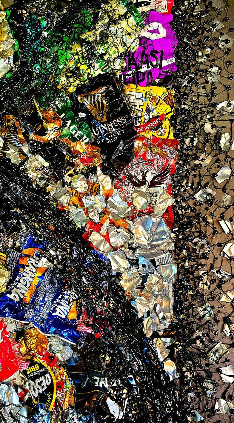 Mues speaks of the individual transformation of matter; Packchwork speaks of its collective recomposition. Together, they form a dialogue: from the introspective gaze of a single crushed can to the architectural energy of an entire surface built from hundreds.