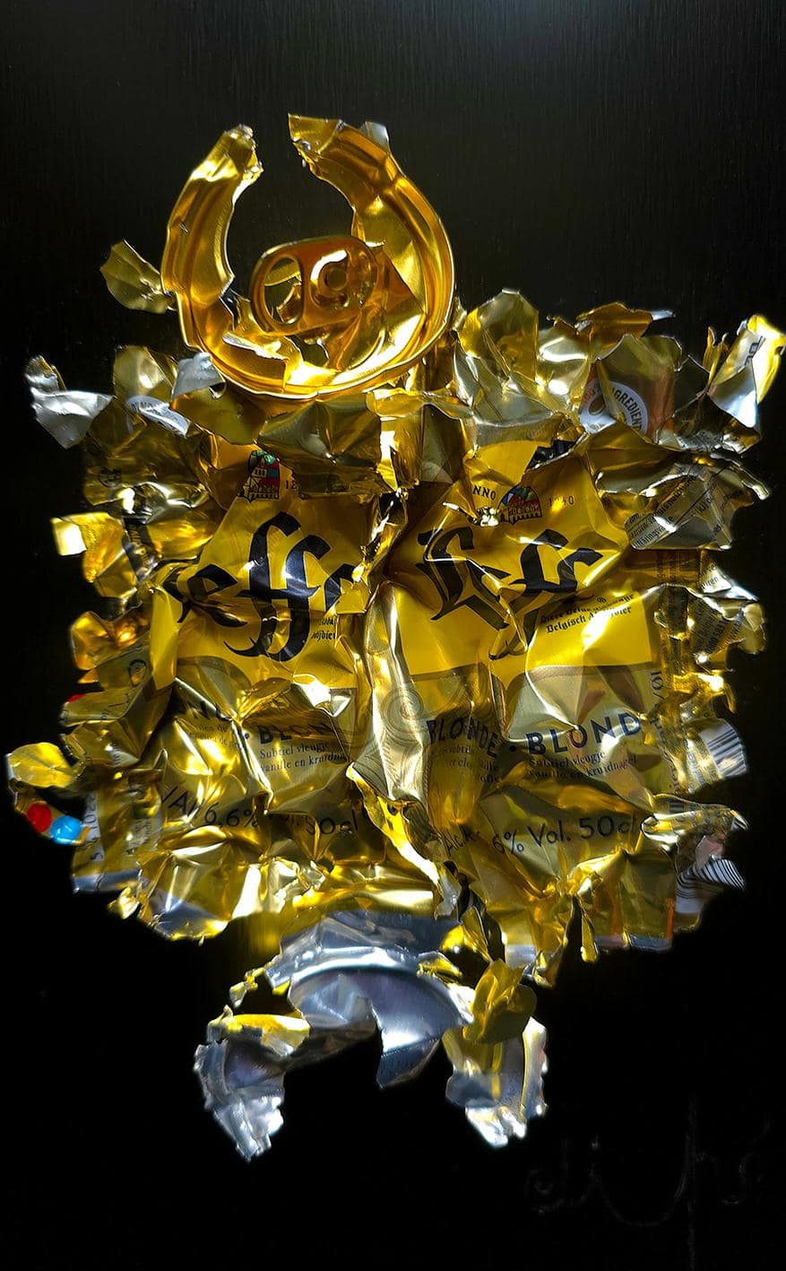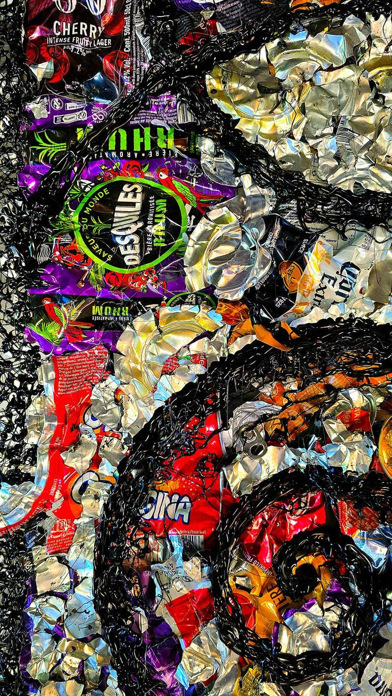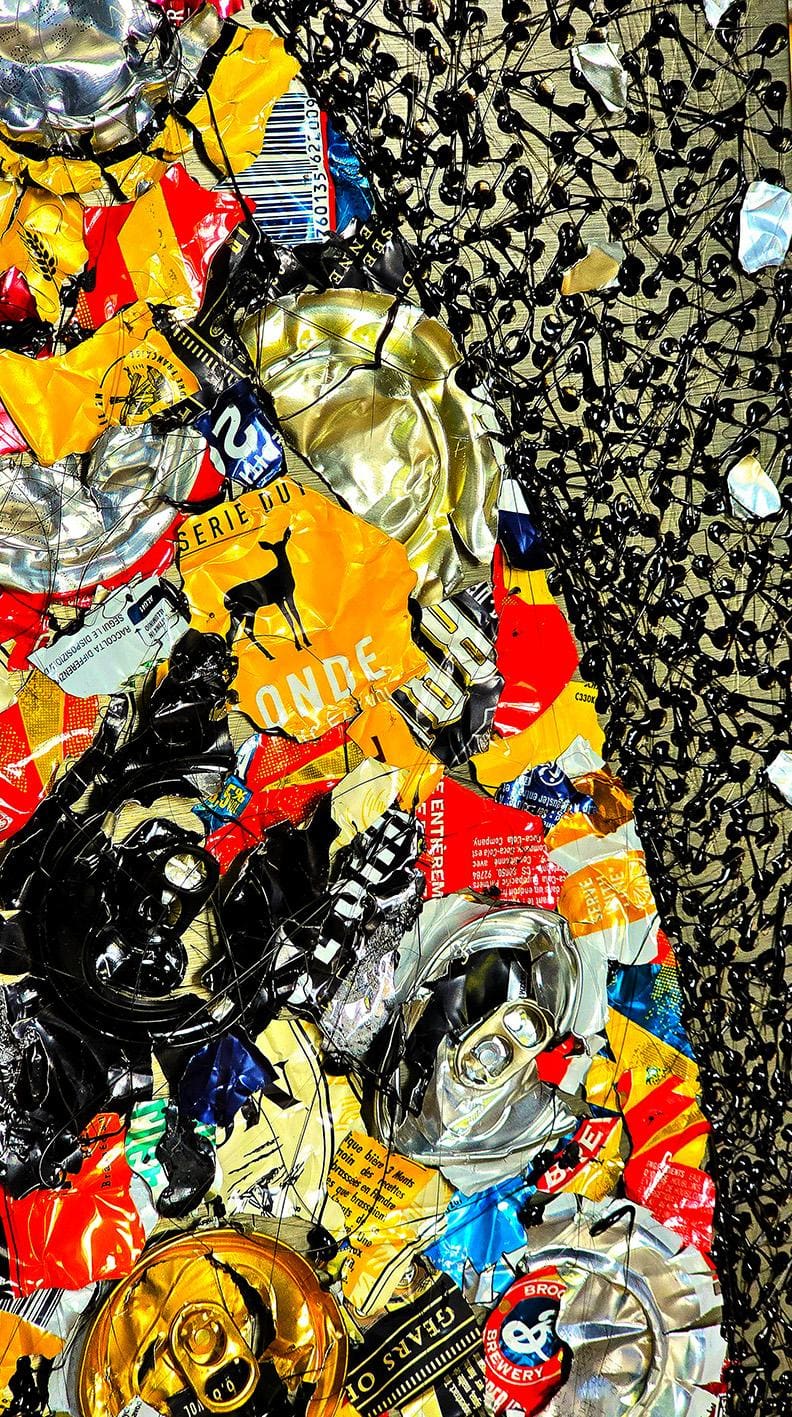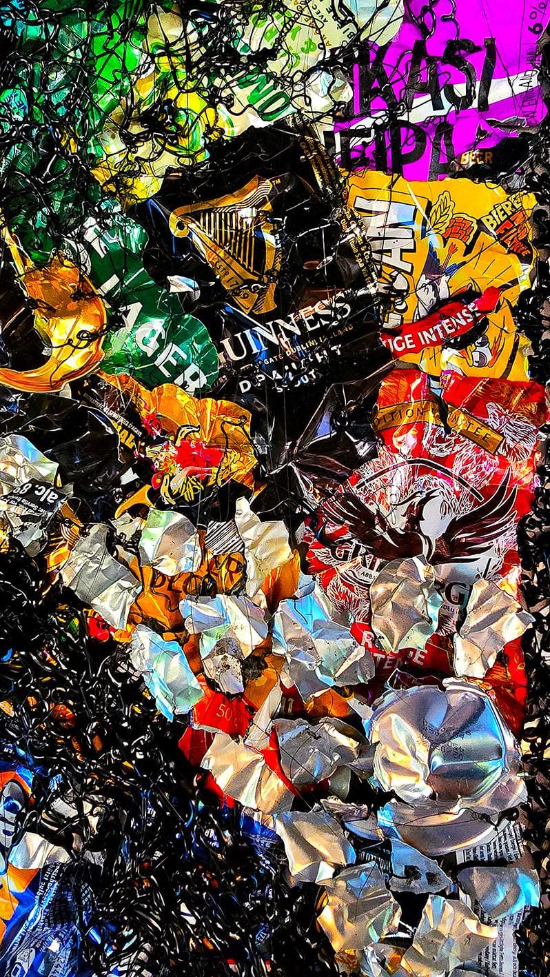 These large collages, born from the same raw material — aluminum cans, compressed boxes, remnants of everyday life — come together like pieces of an industrial puzzle. The title, a play on words between “patchwork” and “pack”, evokes both the handcrafted technique of assemblage and the popular reference to a “pack of beer” — an ironic nod to the overconsumption that fuels these works.