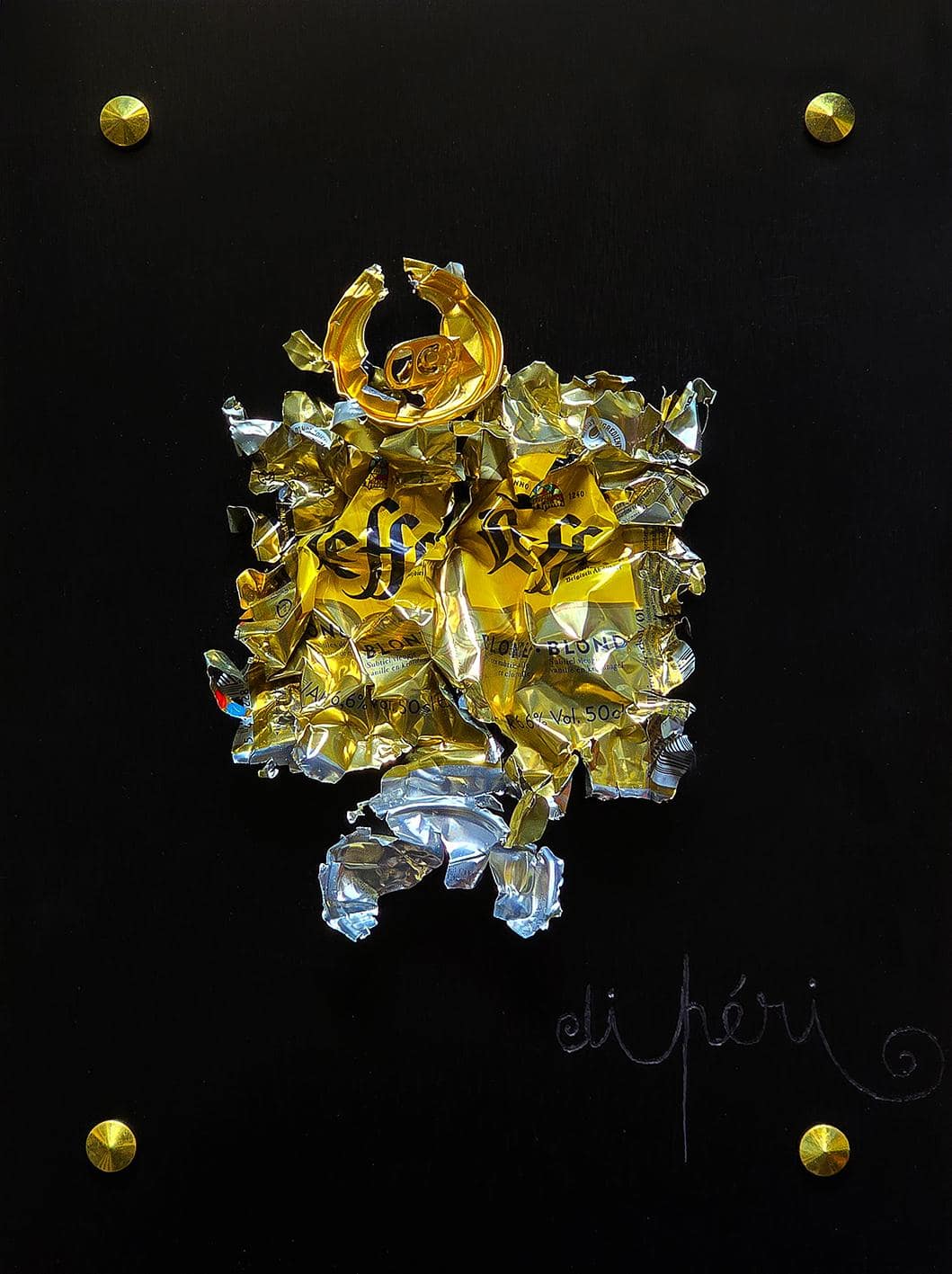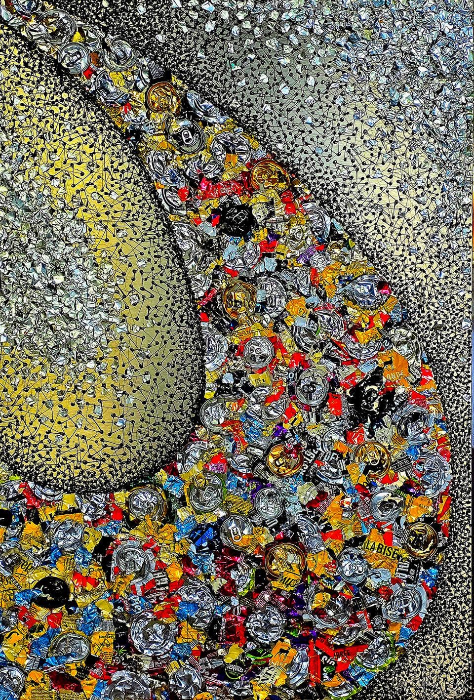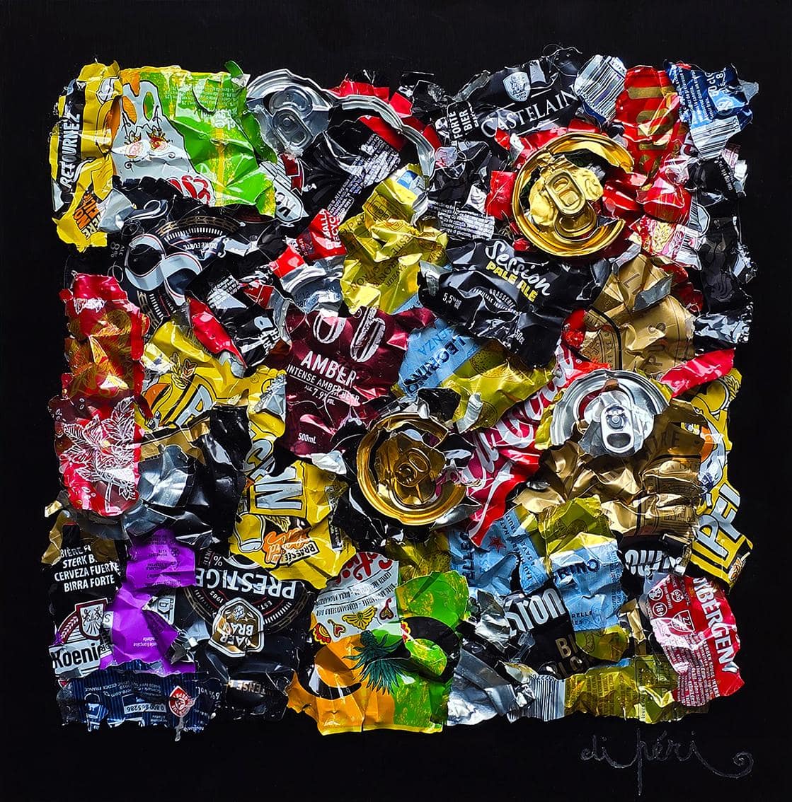 These large collages, born from the same raw material — aluminum cans, compressed boxes, remnants of everyday life — come together like pieces of an industrial puzzle. The title, a play on words between “patchwork” and “pack”, evokes both the handcrafted technique of assemblage and the popular reference to a “pack of beer” — an ironic nod to the overconsumption that fuels these works.