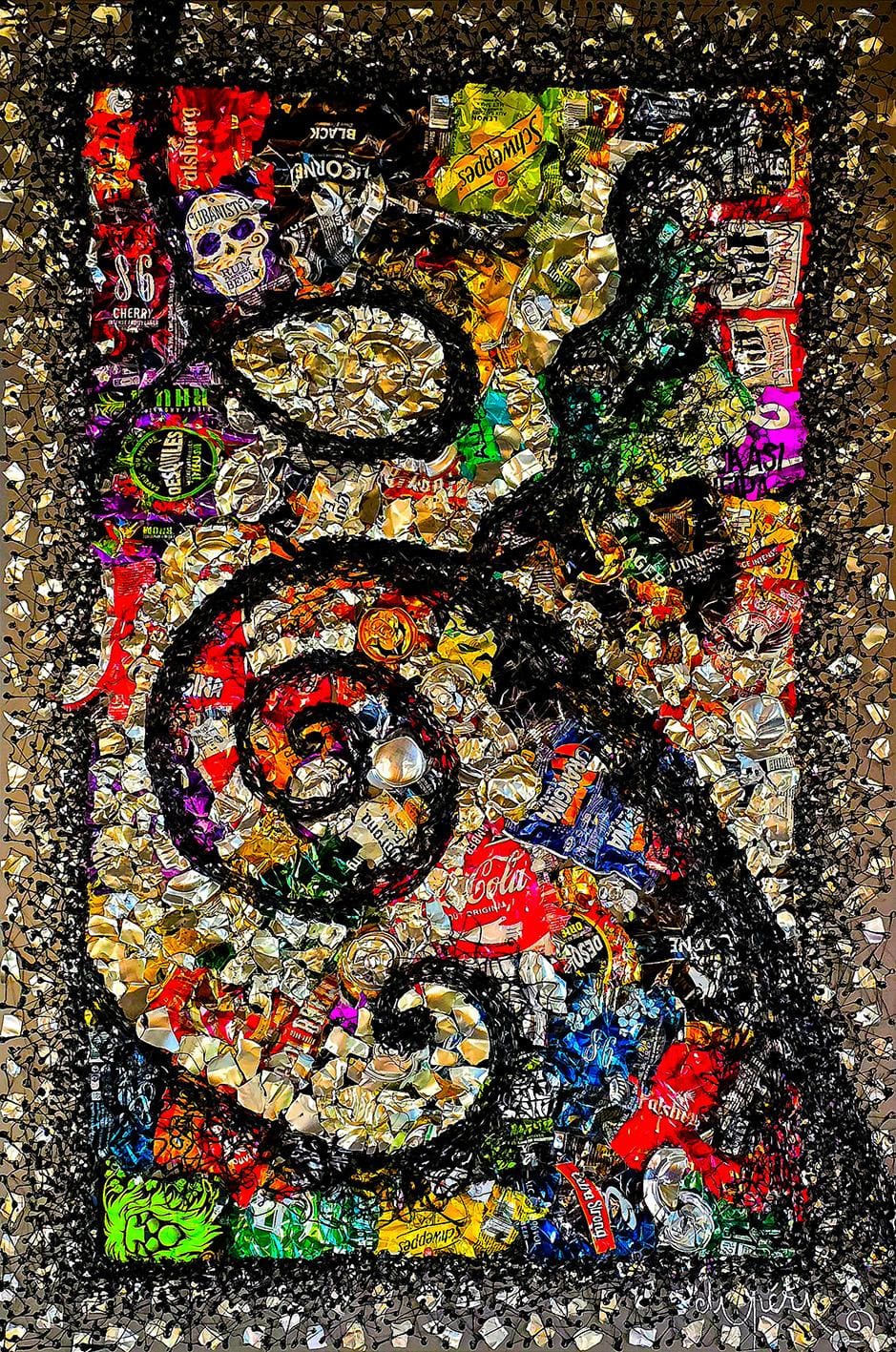 In Packchwork, the “pack” becomes a motif, the can a pixel, the act of crushing a rhythmic gesture. Each collage vibrates with color and density, questioning our relationship with consumption, branding, and transformation.