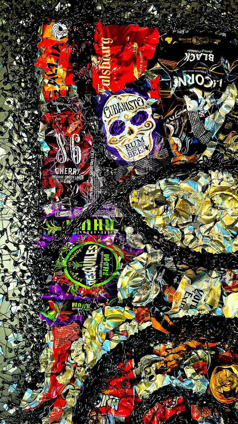 The title Packchwork plays on words: patchwork (an assemblage of diverse fragments) meets pack (as in a pack of beer cans). This double meaning captures the essence of the work — a merging of waste and design, consumption and reconstruction.
